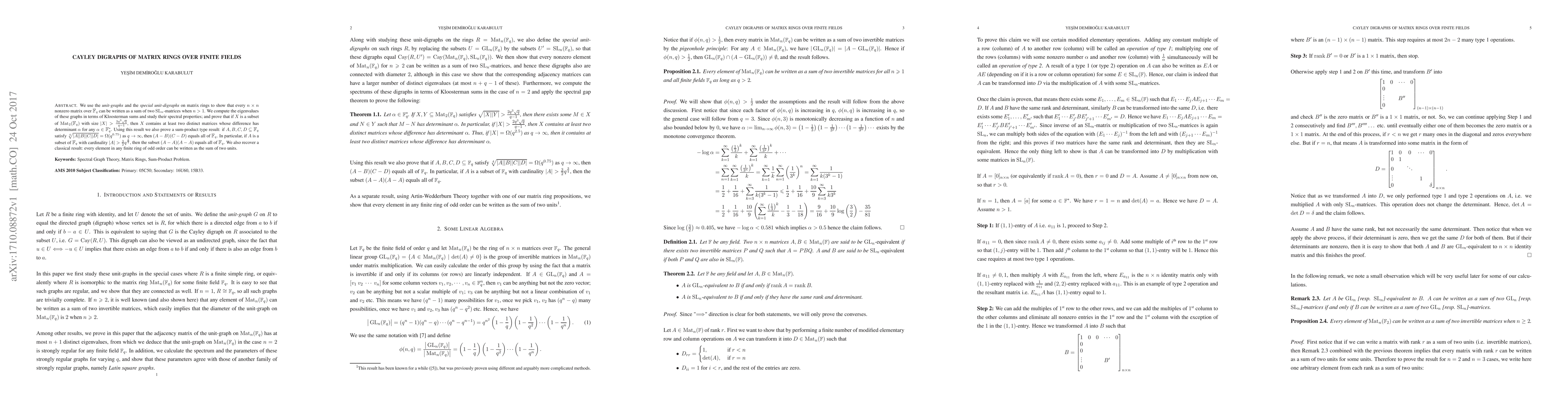 We use the \emph{unit-graphs} and the \emph{special unit-digraphs} on matrix rings to show that every $n \times n$ nonzero matrix over $\Bbb F_q$ can be written as a sum of two $\operatorname{SL}_n$-matrices when $n>1$. We compute the eigenvalues of these graphs in terms of Kloosterman sums and study their spectral properties; and prove that if $X$ is a subset of $\operatorname{Mat}_2 (\Bbb F_q)$ with size $|X| > \frac{2 q^3 \sqrt{q}}{q - 1}$, then $X$ contains at least two distinct matrices whose difference has determinant $\alpha$ for any $\alpha \in \Bbb F_q^{\ast}$. Using this result we also prove a sum-product type result: if $A,B,C,D \subseteq \Bbb F_q$ satisfy $\sqrt[4]{|A||B||C||D|}= \Omega (q^{0.75})$ as $q \rightarrow \infty$, then $(A - B)(C - D)$ equals all of $\Bbb F_q$. In particular, if $A$ is a subset of $\Bbb F_q$ with cardinality $|A| > \frac{3} {2} q^{\frac{3}{4}}$, then the subset $(A - A) (A - A)$ equals all of $\Bbb F_q$. We also recover a classical result: every element in any finite ring of odd order can be written as the sum of two units.