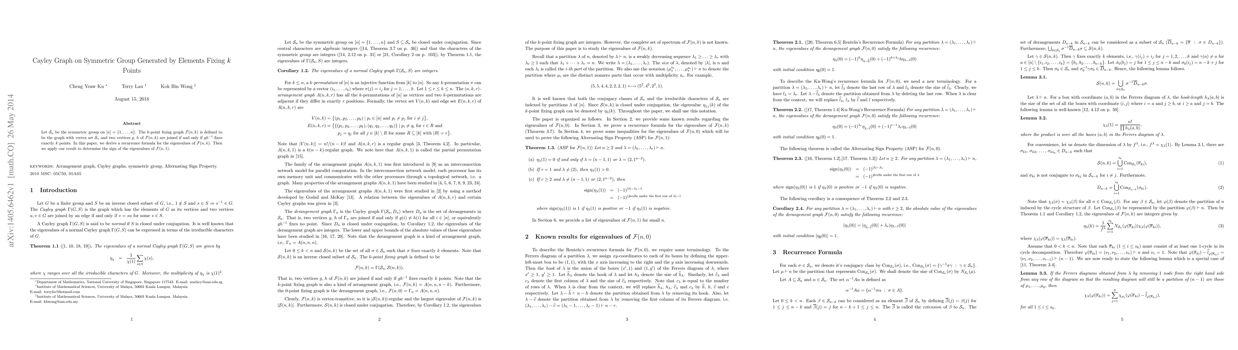 Let $\mathcal{S}_{n}$ be the symmetric group on $[n]=\{1, \ldots, n\}$. The $k$-point fixing graph $\mathcal{F}(n,k)$ is defined to be the graph with vertex set $\mathcal{S}_{n}$ and two vertices $g$, $h$ of $\mathcal{F}(n,k)$ are joined if and only if $gh^{-1}$ fixes exactly $k$ points. In this paper, we derive a recurrence formula for the eigenvalues of $\mathcal{F}(n,k)$. Then we apply our result to determine the sign of the eigenvalues of $\mathcal{F}(n,1)$.