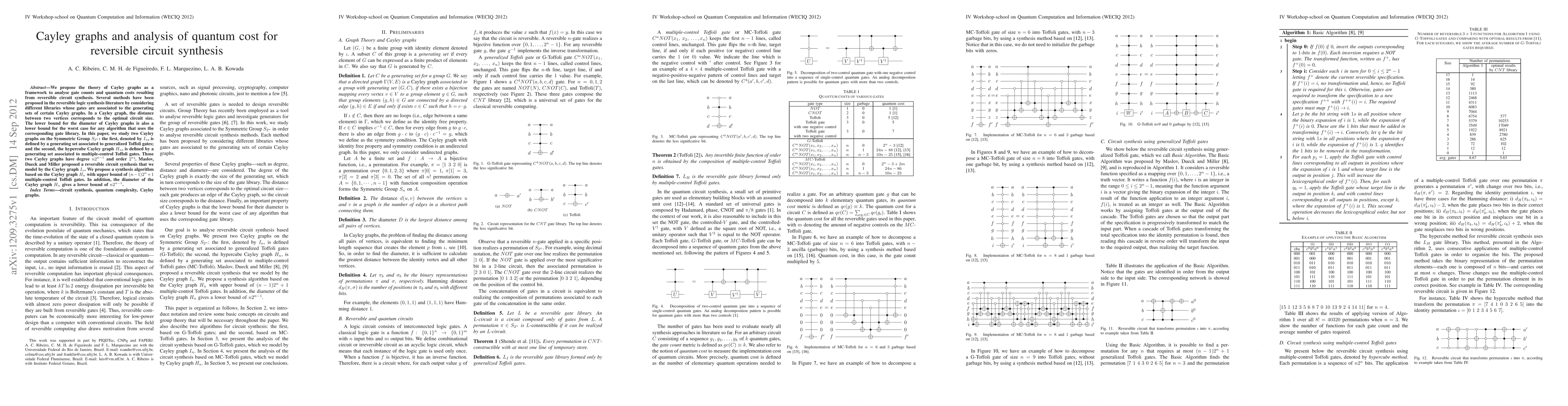 We propose the theory of Cayley graphs as a framework to analyse gate counts and quantum costs resulting from reversible circuit synthesis. Several methods have been proposed in the reversible logic synthesis literature by considering different libraries whose gates are associated to the generating sets of certain Cayley graphs. In a Cayley graph, the distance between two vertices corresponds to the optimal circuit size. The lower bound for the diameter of Cayley graphs is also a lower bound for the worst case for any algorithm that uses the corresponding gate library. In this paper, we study two Cayley graphs on the Symmetric Group $S_{2^n}$: the first, denoted by $I_n$, is defined by a generating set associated to generalized Toffoli gates; and the second, the hypercube Cayley graph $H_n$, is defined by a generating set associated to multiple-control Toffoli gates. Those two Cayley graphs have degree $n2^{n-1}$ and order $2^n!$. Maslov, Dueck and Miller proposed a reversible circuit synthesis that we model by the Cayley graph $I_n$. We propose a synthesis algorithm based on the Cayley graph $H_n$ with upper bound of $(n-1)2^{n}+1$ multiple-control Toffoli gates. In addition, the diameter of the Cayley graph $H_n$ gives a lower bound of $n2^{n-1}$.