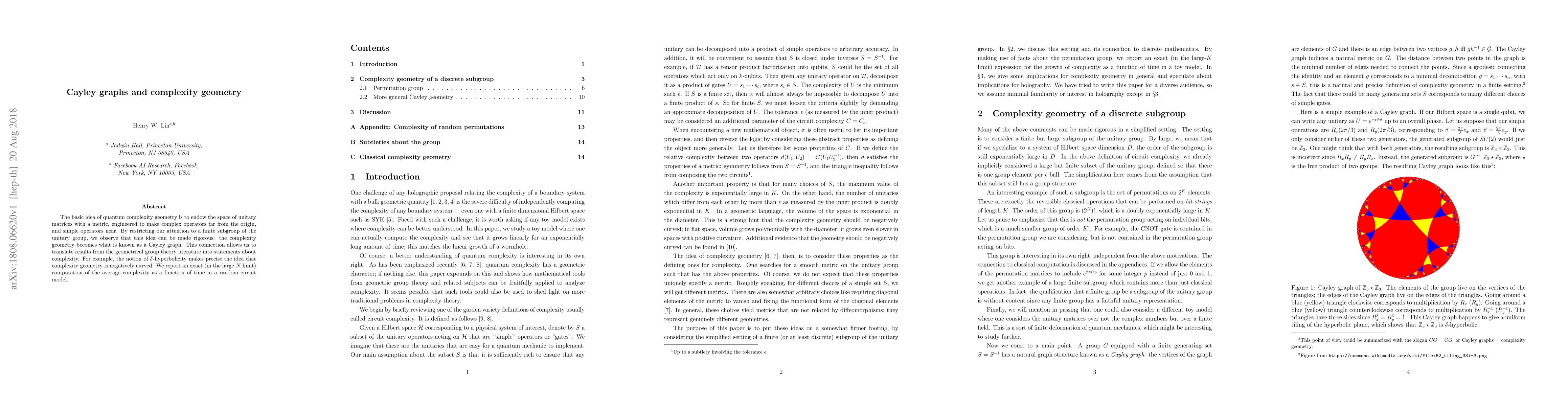 This paper explores the concept of quantum complexity geometry using Cayley graphs, translating geometrical group theory results into complexity statements. It computes the average complexity in a random circuit model, revealing the negative curvature of complexity geometry.