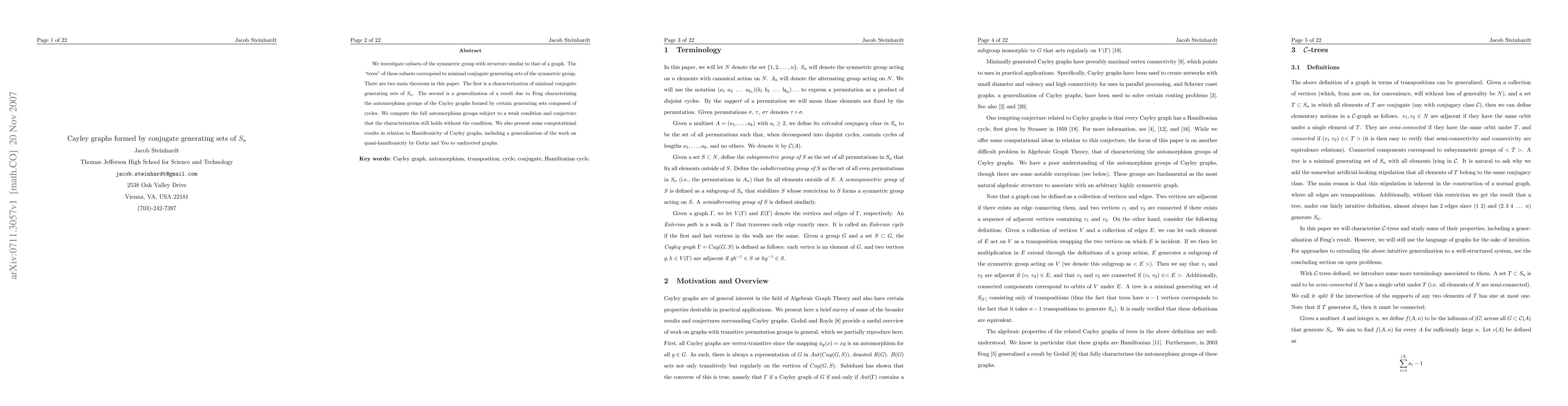 We investigate subsets of the symmetric group with structure similar to that of a graph. The trees of these subsets correspond to minimal conjugate generating sets of the symmetric group. There are two main theorems in this paper. The first is a characterization of minimal conjugate generating sets of S_n. The second is a generalization of a result due to Feng characterizing the automorphism groups of the Cayley graphs formed by certain generating sets composed of cycles. We compute the full automorphism groups subject to a weak condition and conjecture that the characterization still holds without the condition. We also present some computational results in relation to hamiltonicity of Cayley graphs, including a generalization of the work on quasi-hamiltonicity by Gutin and Yeo to undirected graphs.