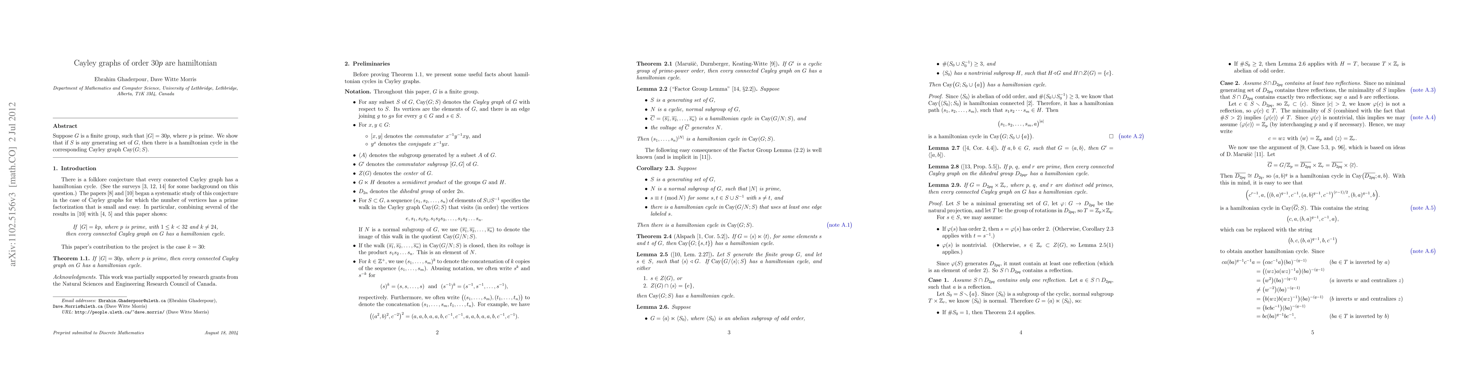Suppose G is a finite group of order 30p, where p is prime. We show that if S is any generating set of G, then there is a hamiltonian cycle in the corresponding Cayley graph Cay(G;S).