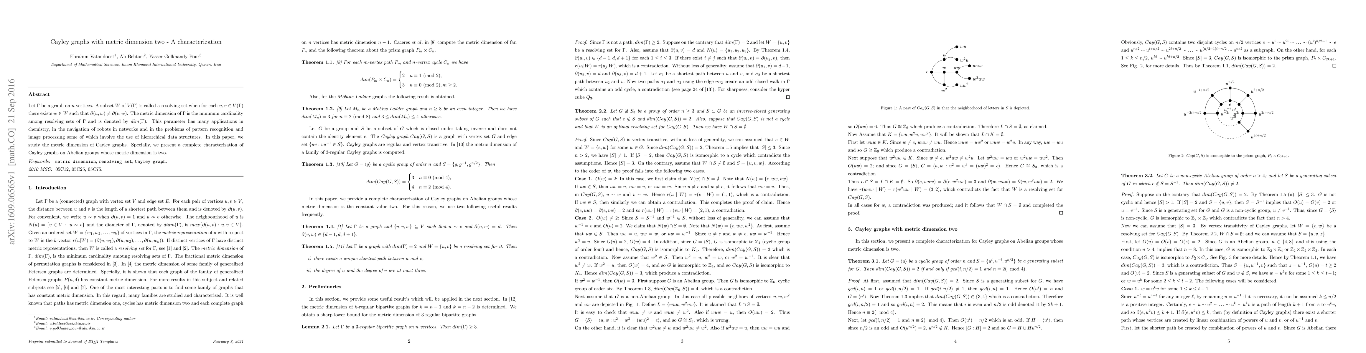 In this paper, we study the metric dimension of Cayley graphs. Specially, we present a complete characterization of Cayley graphs on Abelian groups whose metric dimension is two.