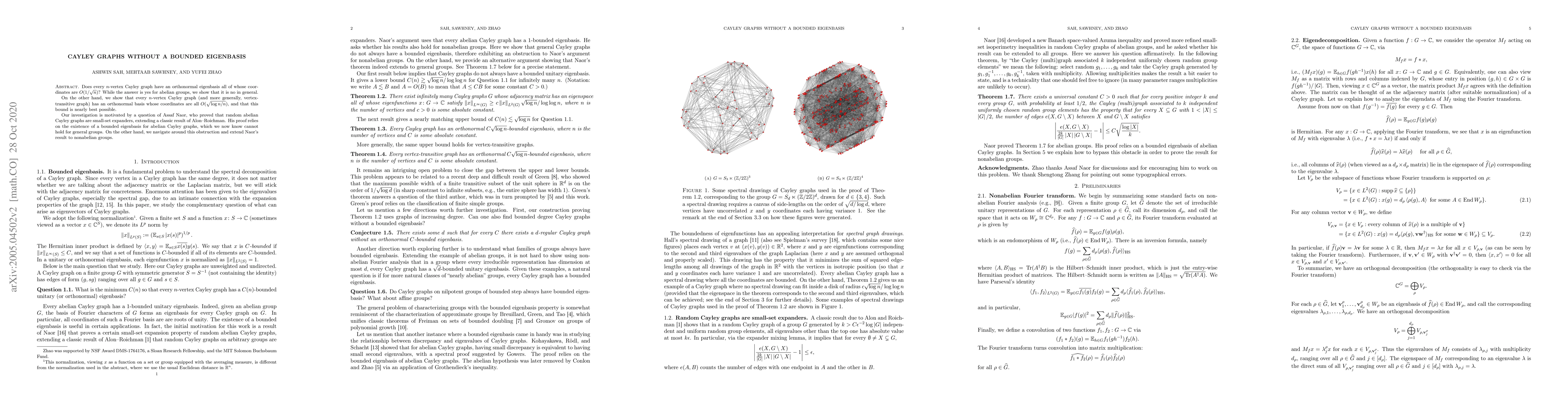 Does every $n$-vertex Cayley graph have an orthonormal eigenbasis all of whose coordinates are $O(1/\sqrt{n})$? While the answer is yes for abelian groups, we show that it is no in general. On the other hand, we show that every $n$-vertex Cayley graph (and more generally, vertex-transitive graph) has an orthonormal basis whose coordinates are all $O(\sqrt{\log n / n})$, and that this bound is nearly best possible. Our investigation is motivated by a question of Assaf Naor, who proved that random abelian Cayley graphs are small-set expanders, extending a classic result of Alon--Roichman. His proof relies on the existence of a bounded eigenbasis for abelian Cayley graphs, which we now know cannot hold for general groups. On the other hand, we navigate around this obstruction and extend Naor's result to nonabelian groups.