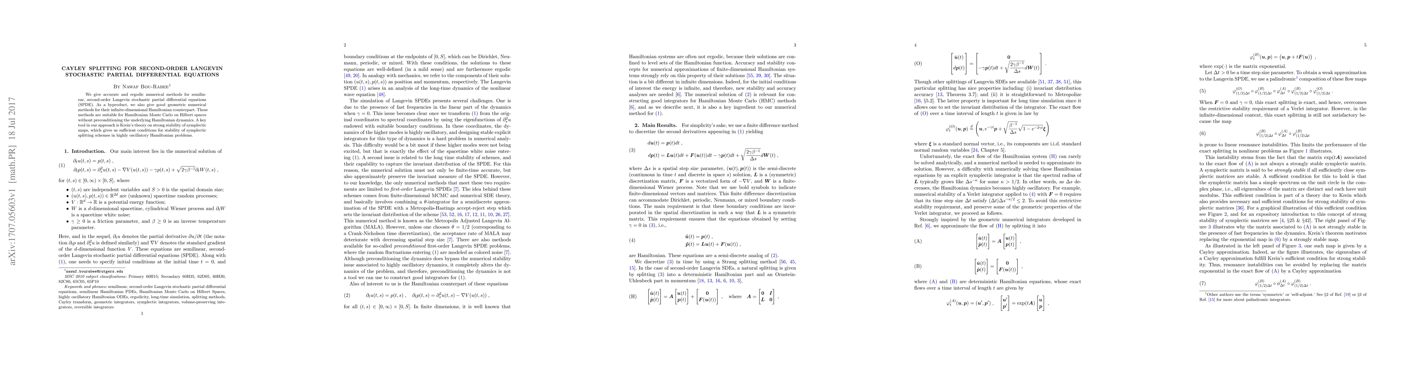 Summary: This paper presents accurate and ergodic numerical methods for solving semilinear, second-order Langevin stochastic partial differential equations, leveraging Krein's theory for symplectic map stability. The methods are also applicable to infinite-dimensional Hamiltonian systems, enabling Hamiltonian Monte Carlo on Hilbert spaces without preconditioning.