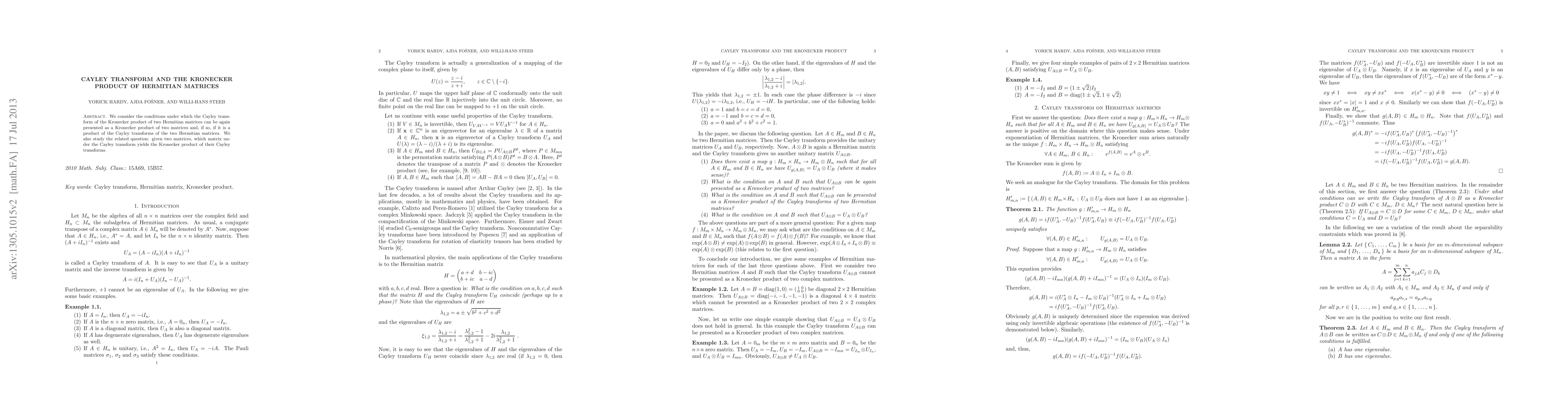This paper investigates the conditions for the Cayley transform of the Kronecker product of two Hermitian matrices to remain a Kronecker product and explores whether it equals the product of the Cayley transforms of the original matrices. It also examines which matrix under the Cayley transform results from the Kronecker product of their Cayley transforms.