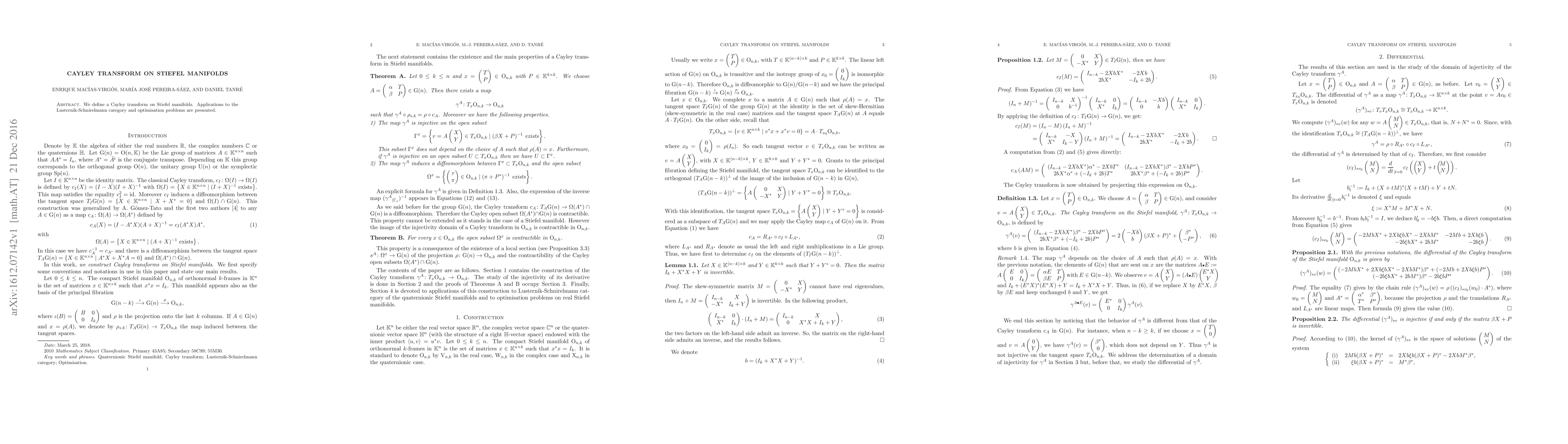 Summary: This paper introduces a Cayley transform on Stiefel manifolds, exploring its applications in enhancing the Lusternik-Schnirelmann category and solving optimization problems. The transform provides new insights into manifold geometry and related mathematical optimizations.