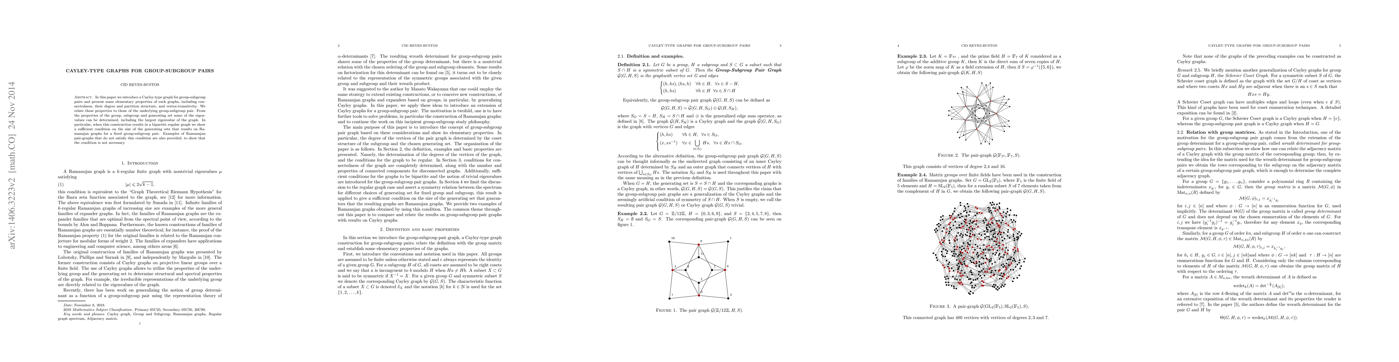 This paper introduces Cayley-type graphs for group-subgroup pairs and explores their properties, including connectedness, degree, partition structure, and vertex-transitivity. It also determines some eigenvalues based on group properties and identifies a sufficient condition for constructing Ramanujan graphs, though it notes that this condition is not necessary.