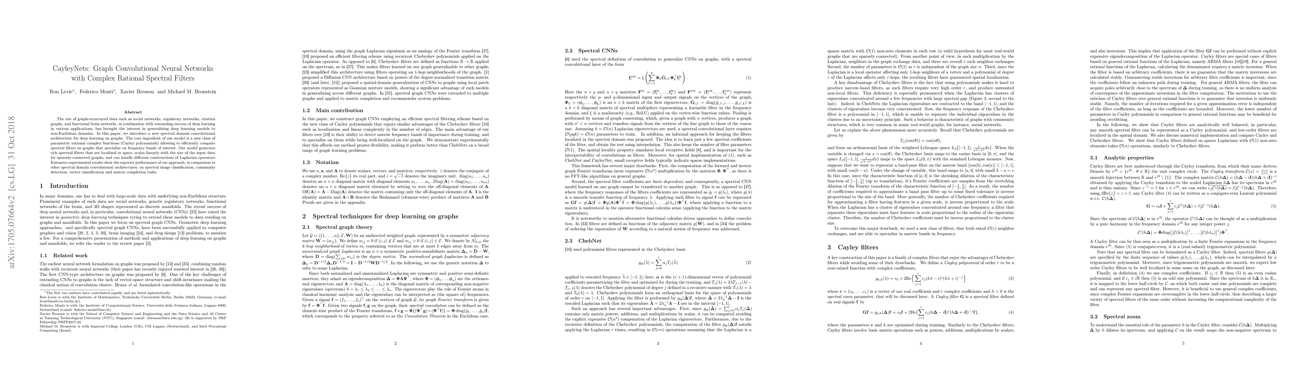 CayleyNets propose a novel graph convolutional neural network using complex rational spectral filters based on Cayley polynomials, demonstrating superior performance on tasks like spectral image classification and community detection. This approach efficiently computes localized spectral filters that scale linearly with graph size.