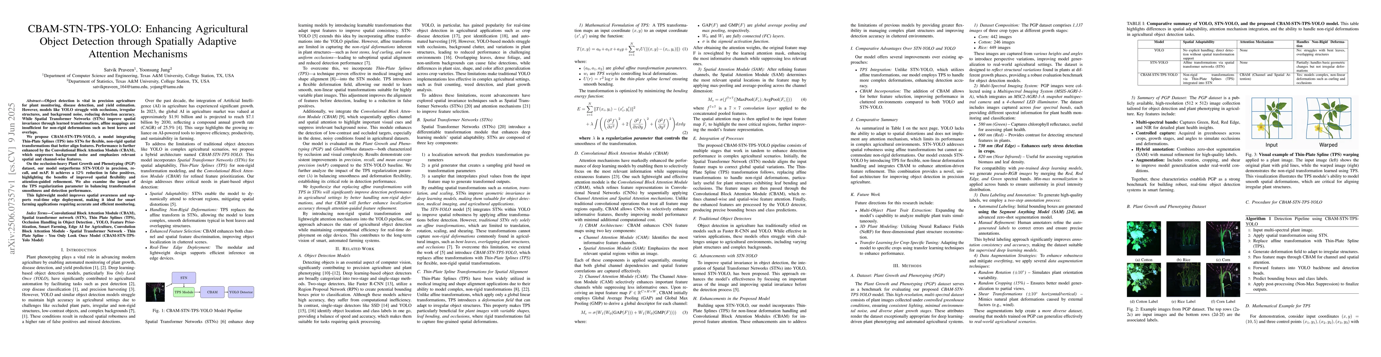 Object detection is vital in precision agriculture for plant monitoring, disease detection, and yield estimation. However, models like YOLO struggle with occlusions, irregular structures, and background noise, reducing detection accuracy. While Spatial Transformer Networks (STNs) improve spatial invariance through learned transformations, affine mappings are insufficient for non-rigid deformations such as bent leaves and overlaps. We propose CBAM-STN-TPS-YOLO, a model integrating Thin-Plate Splines (TPS) into STNs for flexible, non-rigid spatial transformations that better align features. Performance is further enhanced by the Convolutional Block Attention Module (CBAM), which suppresses background noise and emphasizes relevant spatial and channel-wise features. On the occlusion-heavy Plant Growth and Phenotyping (PGP) dataset, our model outperforms STN-YOLO in precision, recall, and mAP. It achieves a 12% reduction in false positives, highlighting the benefits of improved spatial flexibility and attention-guided refinement. We also examine the impact of the TPS regularization parameter in balancing transformation smoothness and detection performance. This lightweight model improves spatial awareness and supports real-time edge deployment, making it ideal for smart farming applications requiring accurate and efficient monitoring.