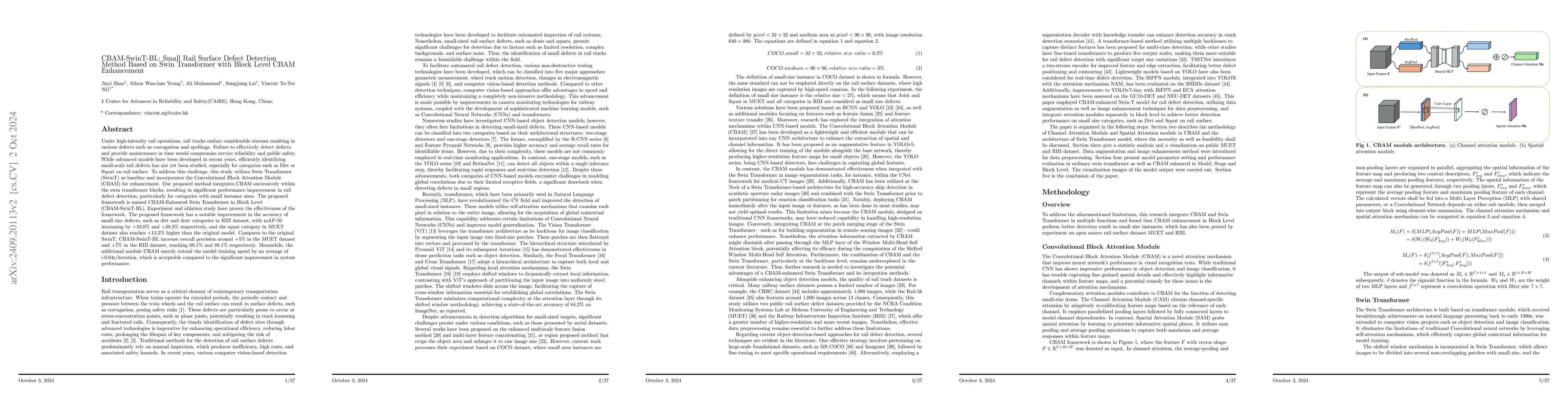The paper proposes a CBAM-Enhanced Swin Transformer in Block Level (CBAM-SwinT-BL) for detecting small rail surface defects, integrating CBAM into the Swin Transformer to significantly improve defect detection accuracy, especially for small instances. Experimental results show notable improvements in accuracy for dirt, dent, and squat defects, with minimal impact on training speed.