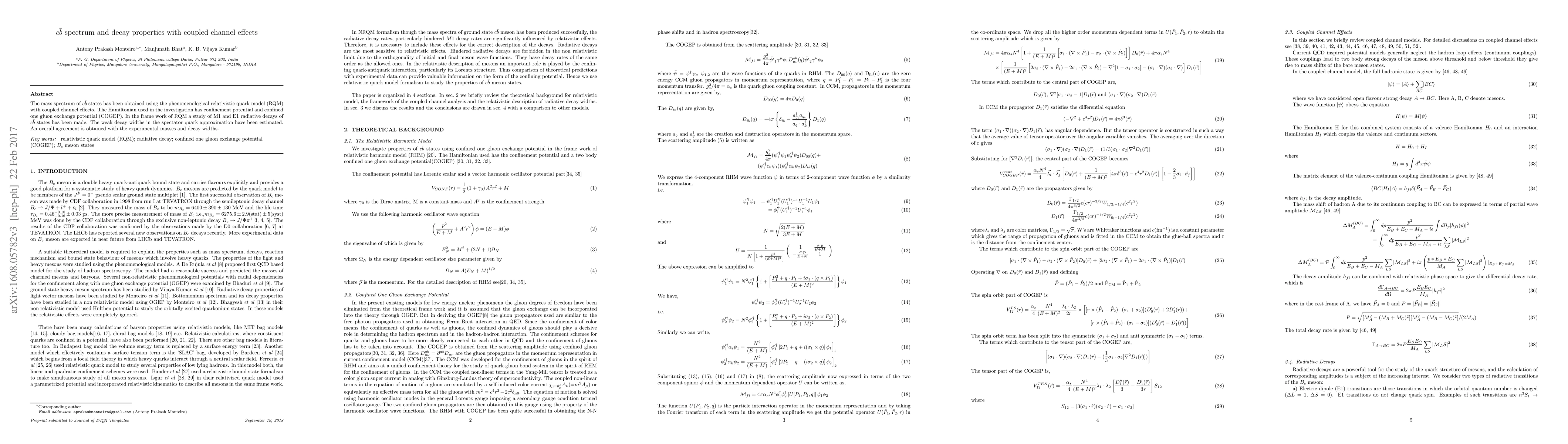 The mass spectrum of $c\bar{b}$ states has been obtained using the phenomenological relativistic quark model (RQM) with coupled channel effects. The Hamiltonian used in the investigation has confinement potential and confined one gluon exchange potential (COGEP). In the frame work of RQM a study of M1 and E1 radiative decays of $c\bar{b}$ states has been made. The weak decay widths in the spectator quark approximation have been estimated. An overall agreement is obtained with the experimental masses and decay widths.