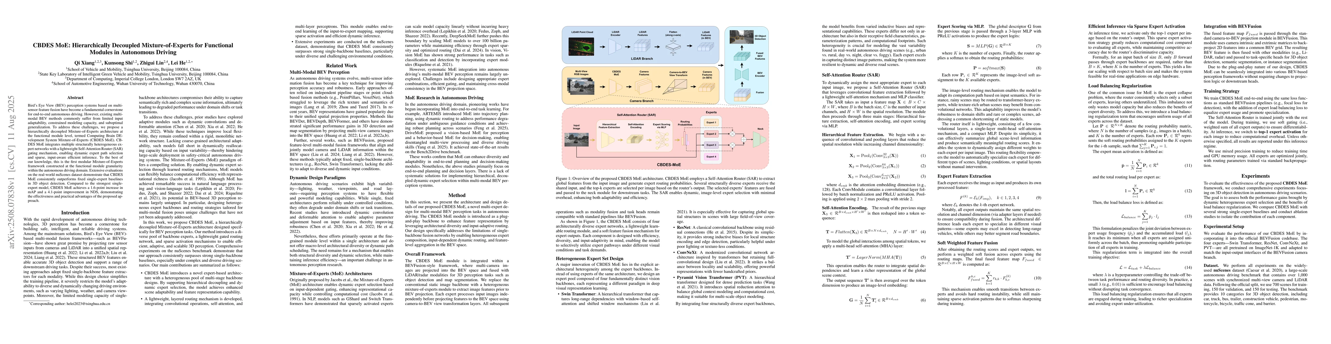 The paper proposes CBDES MoE, a hierarchically decoupled Mixture-of-Experts architecture for functional modules in autonomous driving. It integrates multiple structurally heterogeneous expert networks with a lightweight Self-Attention Router (SAR) for dynamic expert path selection and efficient inference.