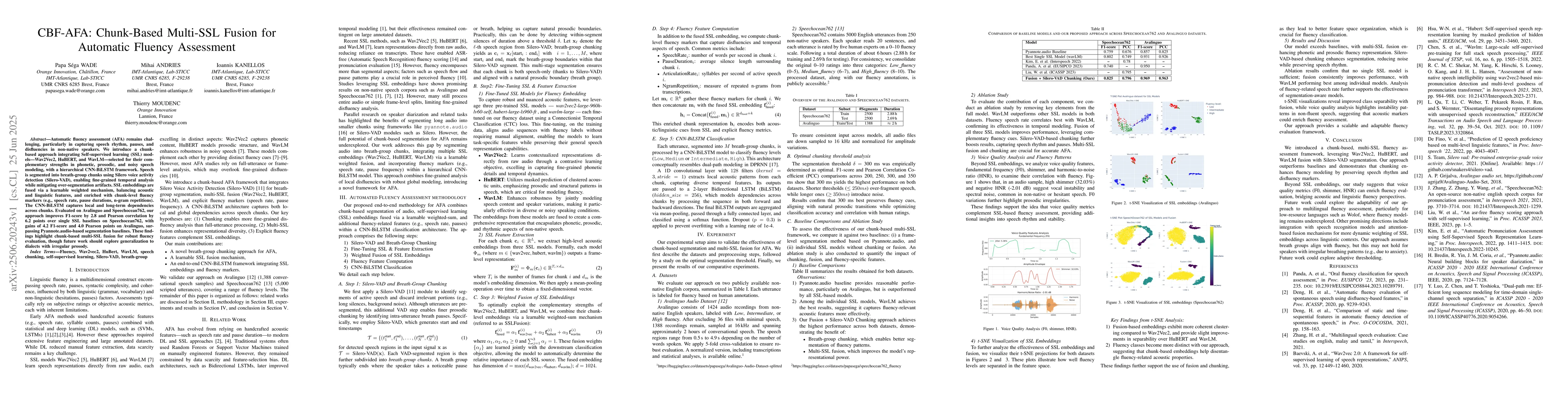 This research introduces CBF-AFA, a chunk-based approach that combines self-supervised learning models (Wav2Vec2, HuBERT, WavLM) for automatic fluency assessment. By segmenting speech into breath-group chunks and fusing SSL embeddings with chunk-level fluency markers, CBF-AFA outperforms single SSL baselines and Pyannote.audio-based segmentation baselines on Avalinguo and Speechocean762 datasets, improving F1-score and Pearson correlation. Future work aims to generalize this method to dialects with irregular prosody.