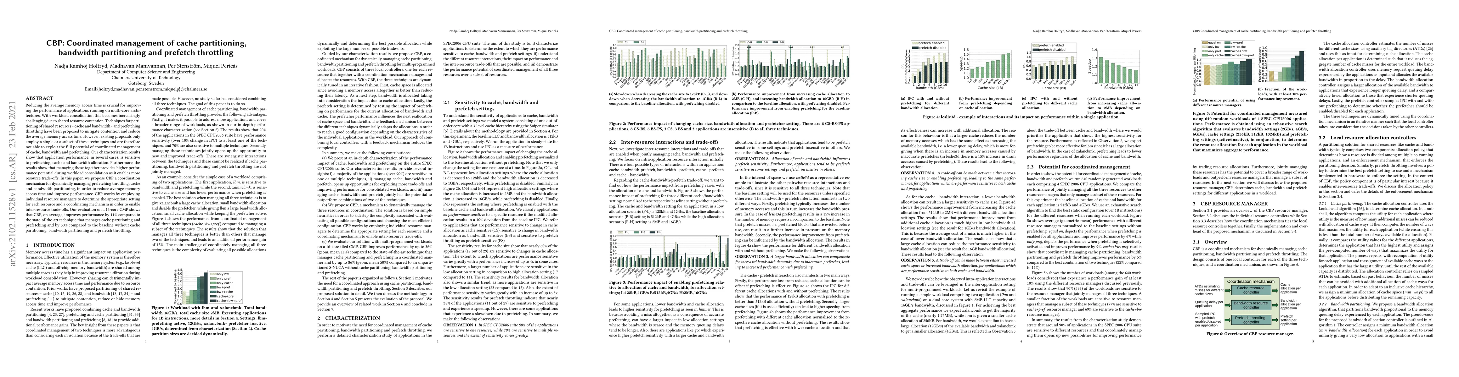 This paper proposes CBP, a mechanism for coordinated management of cache partitioning, bandwidth partitioning, and prefetch throttling to reduce average memory access time and improve performance in multi-core architectures. Evaluations show CBP achieves up to 11% better performance than existing techniques and 50% better than a baseline without these coordinated management strategies.