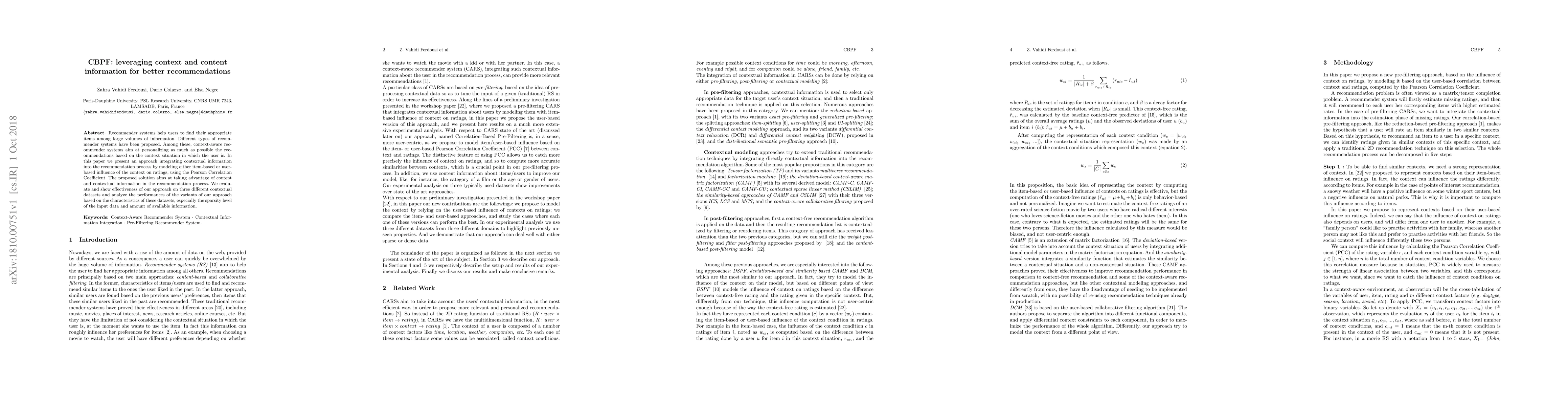 This paper proposes CBPF, a context-aware recommender system that integrates contextual information into the recommendation process using Pearson Correlation Coefficient to model context-based influence on ratings. The effectiveness of the approach is evaluated on three contextual datasets, demonstrating its performance relative to data sparsity and available information.