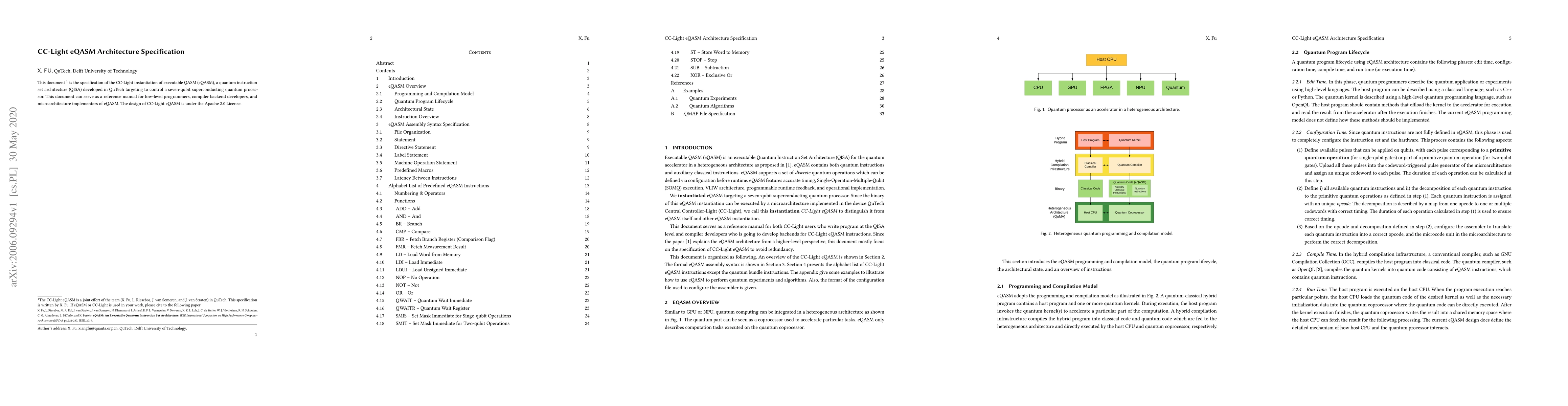 This document specifies the CC-Light instantiation of executable QASM (eQASM), a quantum instruction set architecture for a seven-qubit superconducting quantum processor developed by QuTech. It serves as a reference for programmers, compiler developers, and microarchitecture implementers, released under the Apache 2.0 License.