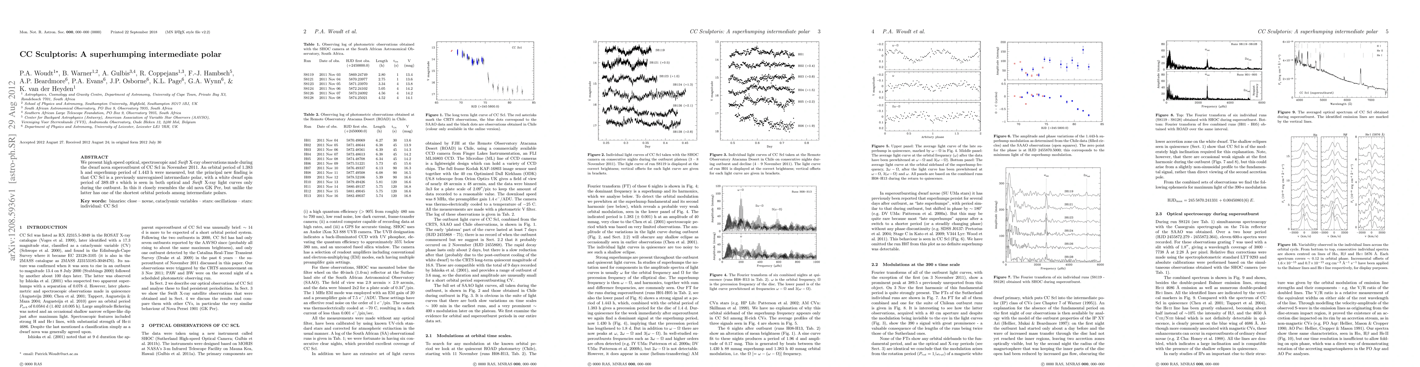 CC Sculptoris is identified as a superhumping intermediate polar with an orbital period of 1.383 h and a superhump period of 1.443 h. The white dwarf's spin period of 389.49 s, observed during the superoutburst, marks it as a unique system resembling GK Per but with a notably shorter orbital period.