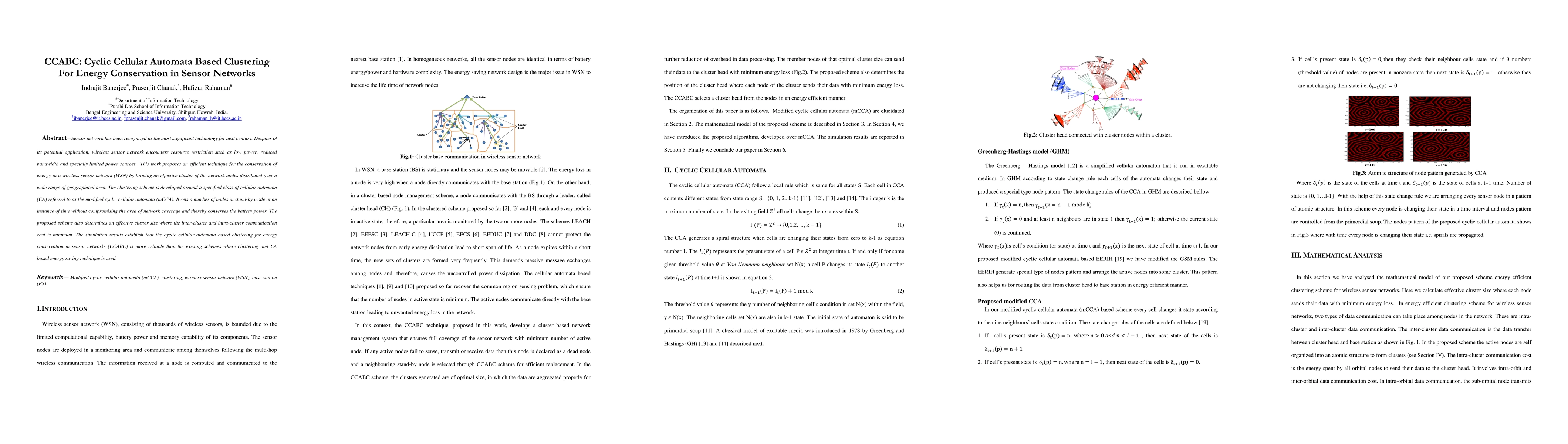 The paper proposes a CCABC technique using cyclic cellular automata based clustering to conserve energy in wireless sensor networks by efficiently managing node clusters and minimizing communication costs. Simulation results show that this method outperforms existing clustering and energy-saving techniques.