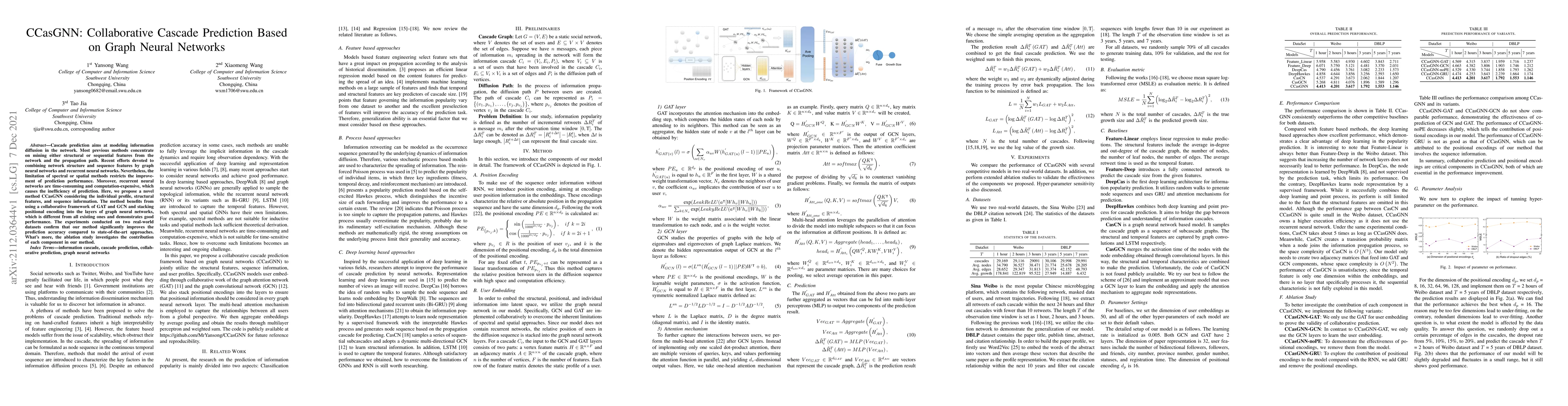 Cascade prediction aims at modeling information diffusion in the network. Most previous methods concentrate on mining either structural or sequential features from the network and the propagation path. Recent efforts devoted to combining network structure and sequence features by graph neural networks and recurrent neural networks. Nevertheless, the limitation of spectral or spatial methods restricts the improvement of prediction performance. Moreover, recurrent neural networks are time-consuming and computation-expensive, which causes the inefficiency of prediction. Here, we propose a novel method CCasGNN considering the individual profile, structural features, and sequence information. The method benefits from using a collaborative framework of GAT and GCN and stacking positional encoding into the layers of graph neural networks, which is different from all existing ones and demonstrates good performance. The experiments conducted on two real-world datasets confirm that our method significantly improves the prediction accuracy compared to state-of-the-art approaches. What's more, the ablation study investigates the contribution of each component in our method.