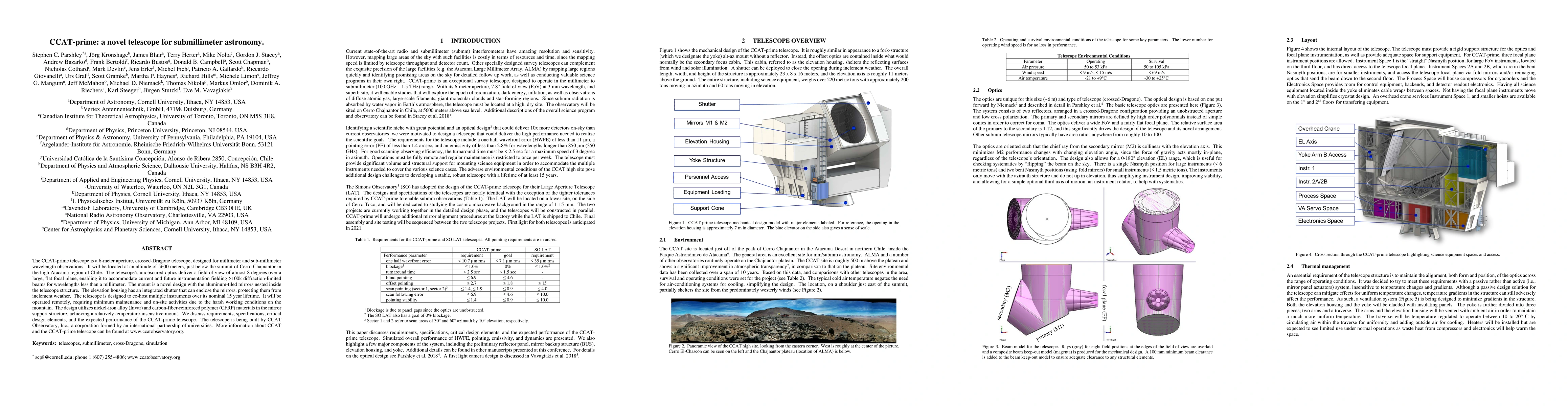 The CCAT-prime telescope, a 6-meter aperture crossed-Dragone design, is intended for millimeter and submillimeter astronomy in the high Atacama region of Chile. It features an unobscured optics design, a novel aluminum-tiled mirror mount, and an integrated shutter for weather protection, aiming for minimal maintenance and remote operation.