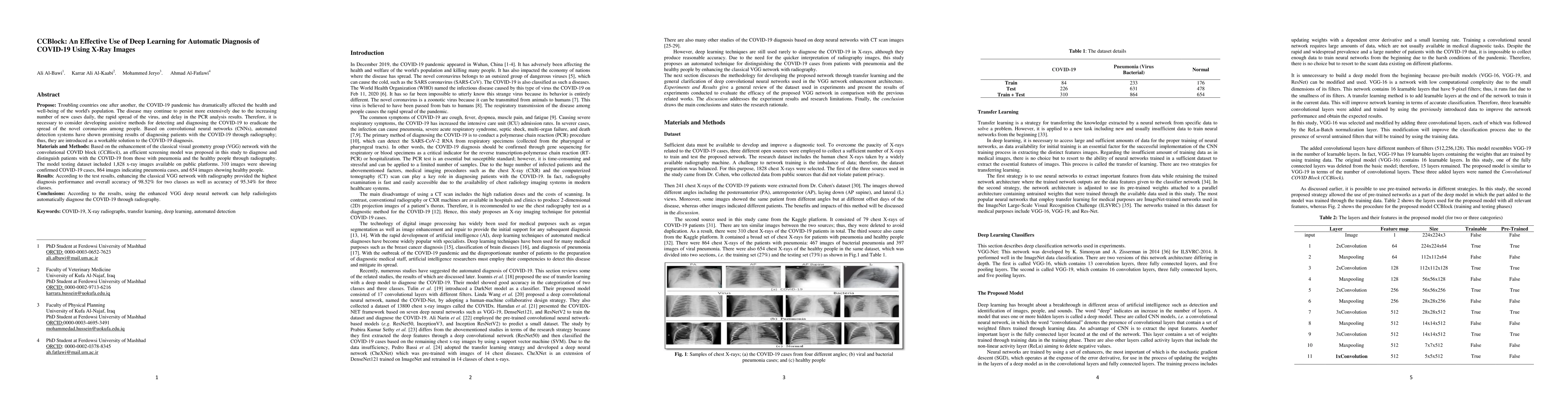 Propose: Troubling countries one after another, the COVID-19 pandemic has dramatically affected the health and well-being of the world's population. The disease may continue to persist more extensively due to the increasing number of new cases daily, the rapid spread of the virus, and delay in the PCR analysis results. Therefore, it is necessary to consider developing assistive methods for detecting and diagnosing the COVID-19 to eradicate the spread of the novel coronavirus among people. Based on convolutional neural networks (CNNs), automated detection systems have shown promising results of diagnosing patients with the COVID-19 through radiography; thus, they are introduced as a workable solution to the COVID-19 diagnosis. Materials and Methods: Based on the enhancement of the classical visual geometry group (VGG) network with the convolutional COVID block (CCBlock), an efficient screening model was proposed in this study to diagnose and distinguish patients with the COVID-19 from those with pneumonia and the healthy people through radiography. The model testing dataset included 1,828 x-ray images available on public platforms. 310 images were showing confirmed COVID-19 cases, 864 images indicating pneumonia cases, and 654 images showing healthy people. Results: According to the test results, enhancing the classical VGG network with radiography provided the highest diagnosis performance and overall accuracy of 98.52% for two classes as well as accuracy of 95.34% for three classes. Conclusions: According to the results, using the enhanced VGG deep neural network can help radiologists automatically diagnose the COVID-19 through radiography.