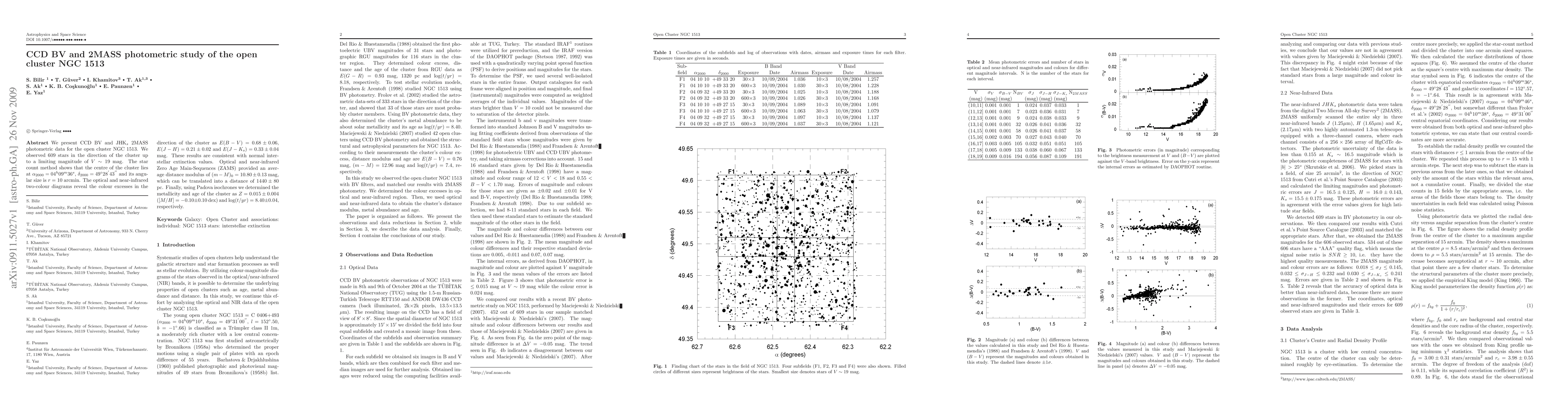We present CCD BV and JHK$_{s}$ 2MASS photometric data for the open cluster NGC 1513. We observed 609 stars in the direction of the cluster up to a limiting magnitude of $V\sim19$ mag. The star count method shows that the centre of the cluster lies at $\alpha_{2000}=04^{h}09^{m}36^{s}$, $\delta_{2000}=49^{\circ}28^{'}43^{''}$ and its angular size is $r=10$ arcmin. The optical and near-infrared two-colour diagrams reveal the colour excesses in the direction of the cluster as $E(B-V)=0.68\pm0.06$, $E(J-H)=0.21\pm0.02$ and $E(J-K_{s})=0.33\pm0.04$ mag. These results are consistent with normal interstellar extinction values. Optical and near-infrared Zero Age Main-Sequences (ZAMS) provided an average distance modulus of $(m-M)_{0}=10.80\pm0.13$ mag, which can be translated into a distance of $1440\pm80$ pc. Finally, using Padova isochrones we determined the metallicity and age of the cluster as $Z=0.015\pm 0.004$ ($[M/H]=-0.10 \pm 0.10$ dex) and $\log (t/yr) = 8.40\pm0.04$, respectively.