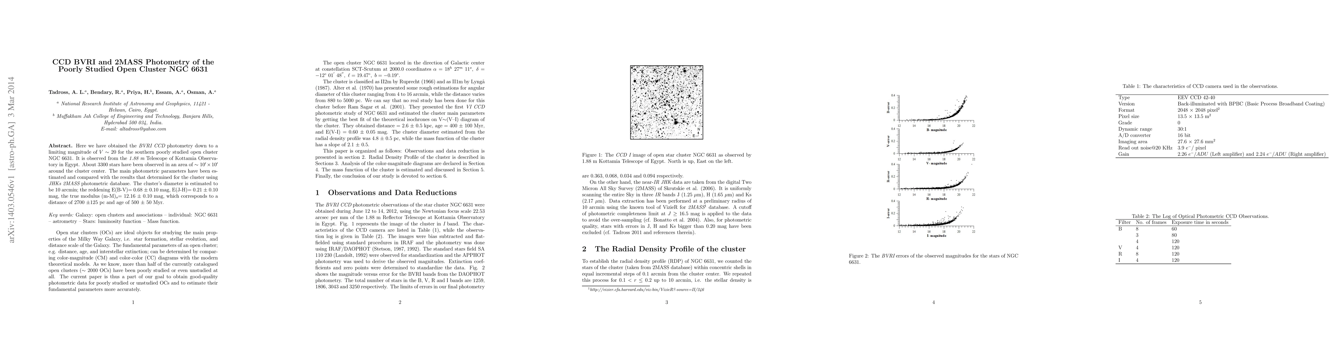 This study presents {\it BVRI CCD} photometry for the poorly studied open cluster NGC 6631, revealing a cluster diameter of 10 arcmin and an estimated age of 500 Myr, with a distance of 2700 pc and reddening values derived from both optical and infrared data.