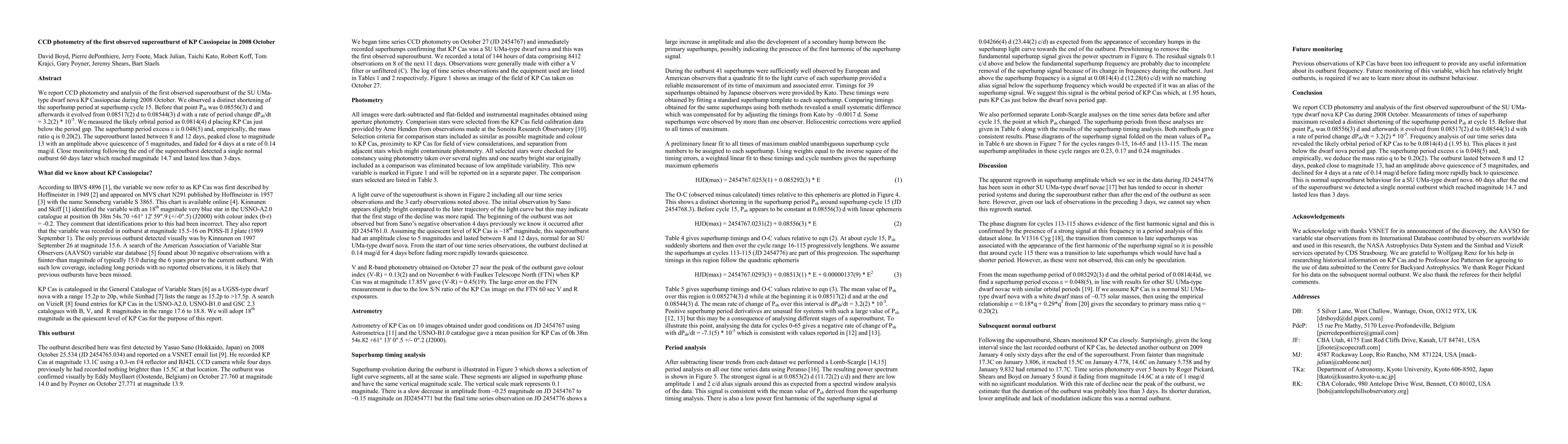 The study presents the first superoutburst observation of KP Cassiopeiae, a SU UMa-type dwarf nova in 2008. It details a shortening of the superhump period, measurement of an orbital period just below the period gap, and determination of a mass ratio. The superoutburst lasted 8-12 days with a magnitude increase of 5, followed by a normal outburst 60 days later.