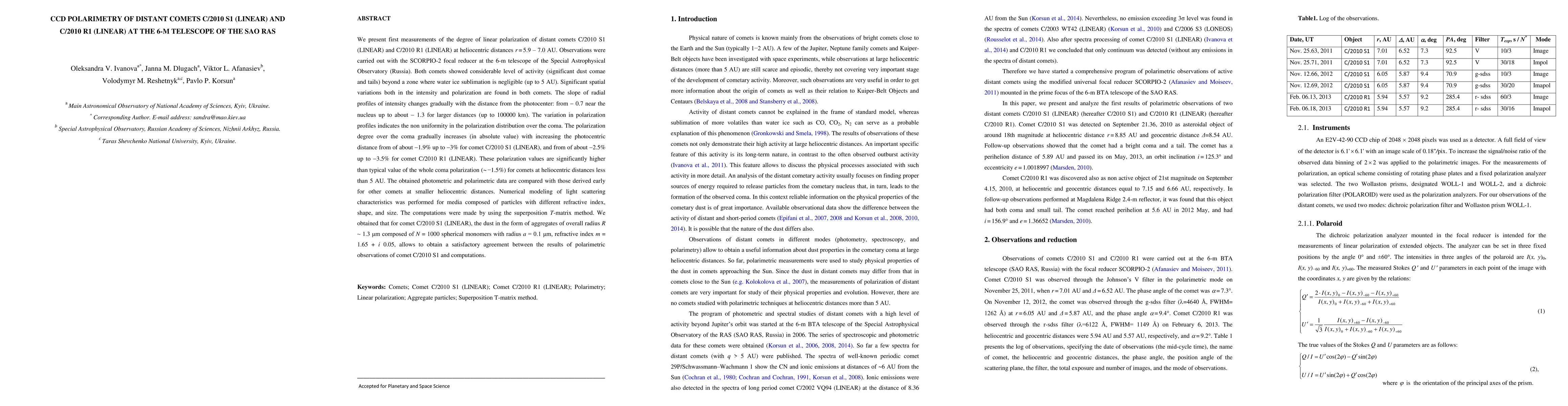 This paper reports the first measurements of the linear polarization of distant comets C/2010 S1 and C/2010 R1 at heliocentric distances of 5.9 - 7.0 AU, revealing significant spatial variations and higher polarization degrees compared to comets at closer distances. Numerical modeling suggests that the dust composition in comet C/2010 S1 comprises aggregates of spherical monomers, providing a good fit for observed polarization data.