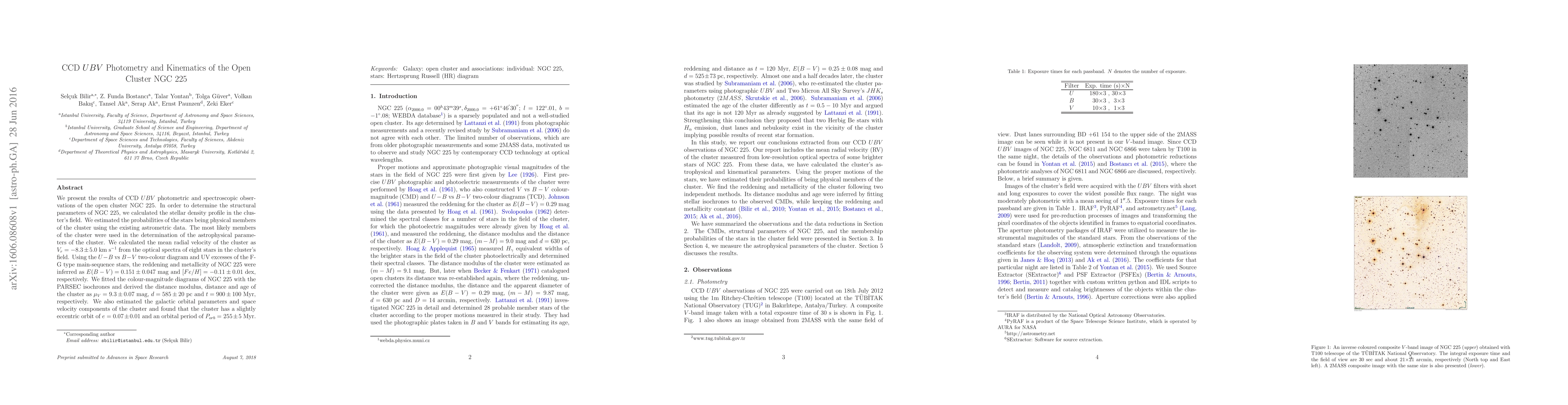This study presents CCD UBV photometry and spectroscopic data for the open cluster NGC 225, determining its structural parameters, radial velocity, and astrophysical properties. The cluster's distance, age, and galactic orbital parameters were derived, revealing a distance of 585±20 pc, an age of 900±100 Myr, and a slightly eccentric orbit.