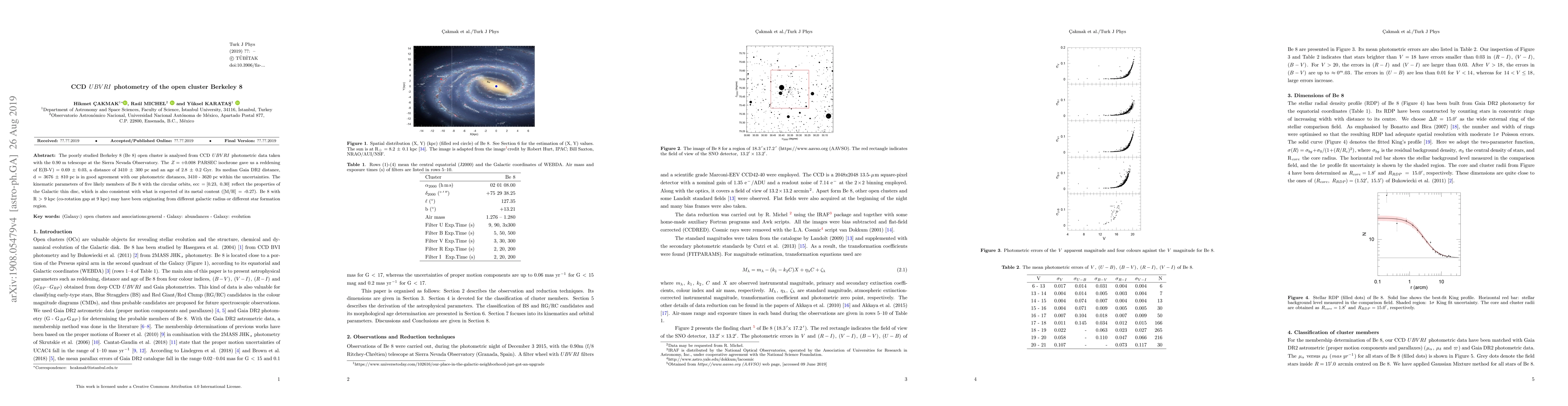 The poorly studied Berkeley 8 (Be8) open cluster is analysed from CCD UBVRI photometric data taken with the 0.90 m telescope at the Sierra Nevada Observatory. The Z = +0.008 PARSEC isochrone gave us a reddening of E(B-V) = 0.69 +- 0.03, a distance of 3410 +- 300 pc and an age of 2.8 +- 0.2 Gyr. Its median Gaia DR2 distance, d = 3676 +- 810 pc is in good agreement with our photometric distances, 3410 - 3620 pc within the uncertainties. The kinematic parameters of five likely members of Be 8 with the circular orbits, ecc = [0.23, 0.30] reflect the properties of the Galactic thin disc, which is also consistent with what is expected of its metal content ([M/H] = -0.27). Be8 with R > 9 kpc (co-rotation gap at 9 kpc) may have been originating from different galactic radius or different star formation region.