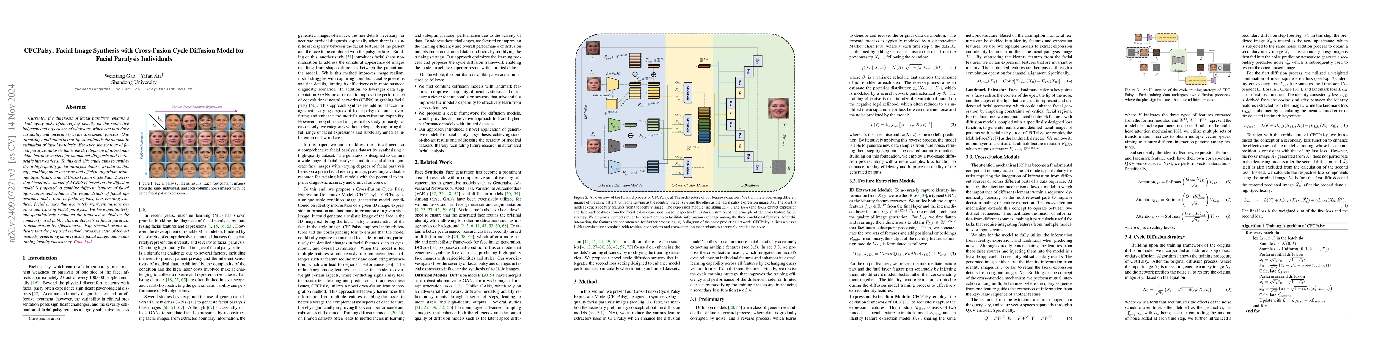 This study introduces the CCFExp model, a Cycle Cross-Fusion Diffusion Model, to synthesize high-quality facial paralysis datasets, addressing the scarcity of such data. The model creates realistic synthetic facial images that accurately depict different types and degrees of facial paralysis, outperforming existing methods in both visual realism and identity consistency.
