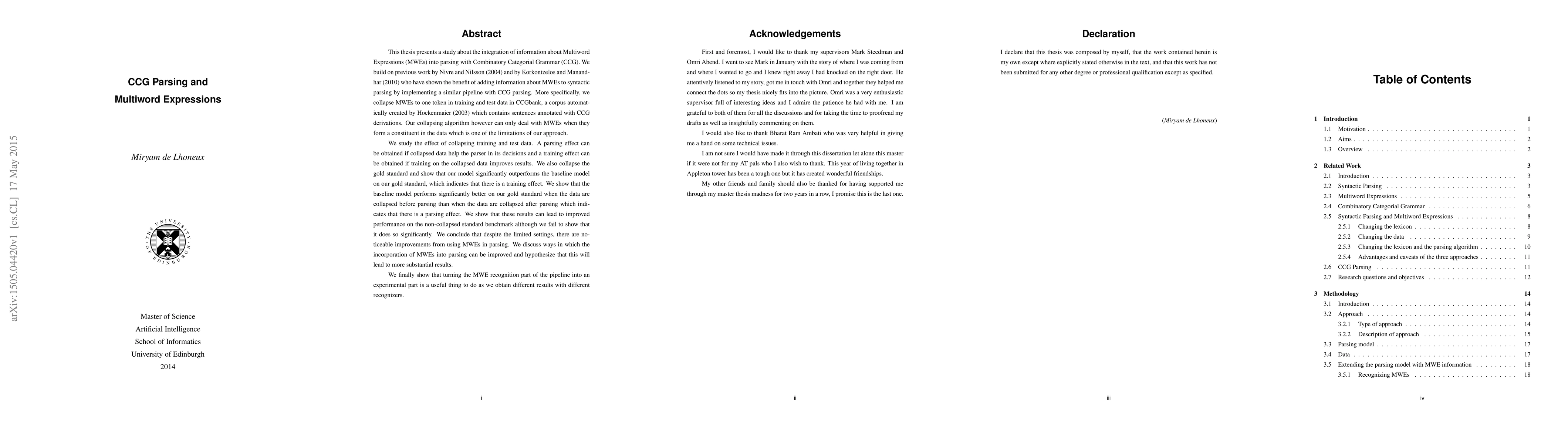 This thesis presents a study about the integration of information about Multiword Expressions (MWEs) into parsing with Combinatory Categorial Grammar (CCG). We build on previous work which has shown the benefit of adding information about MWEs to syntactic parsing by implementing a similar pipeline with CCG parsing. More specifically, we collapse MWEs to one token in training and test data in CCGbank, a corpus which contains sentences annotated with CCG derivations. Our collapsing algorithm however can only deal with MWEs when they form a constituent in the data which is one of the limitations of our approach. We study the effect of collapsing training and test data. A parsing effect can be obtained if collapsed data help the parser in its decisions and a training effect can be obtained if training on the collapsed data improves results. We also collapse the gold standard and show that our model significantly outperforms the baseline model on our gold standard, which indicates that there is a training effect. We show that the baseline model performs significantly better on our gold standard when the data are collapsed before parsing than when the data are collapsed after parsing which indicates that there is a parsing effect. We show that these results can lead to improved performance on the non-collapsed standard benchmark although we fail to show that it does so significantly. We conclude that despite the limited settings, there are noticeable improvements from using MWEs in parsing. We discuss ways in which the incorporation of MWEs into parsing can be improved and hypothesize that this will lead to more substantial results. We finally show that turning the MWE recognition part of the pipeline into an experimental part is a useful thing to do as we obtain different results with different recognizers.