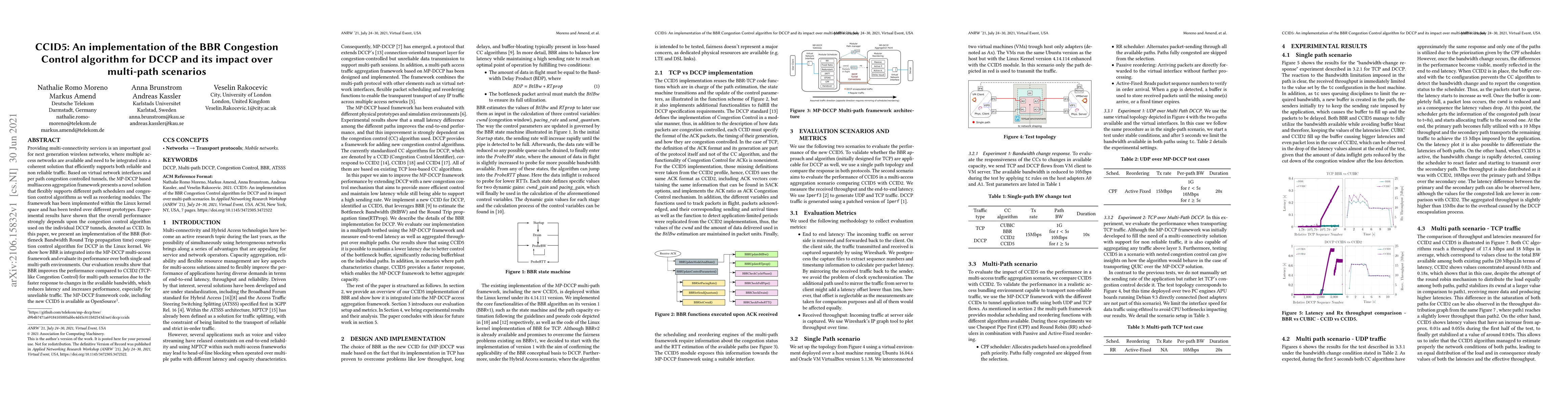 Providing multi-connectivity services is an important goal for next generation wireless networks, where multiple access networks are available and need to be integrated into a coherent solution that efficiently supports both reliable and non reliable traffic. Based on virtual network interfaces and per path congestion controlled tunnels, the MP-DCCP based multiaccess aggregation framework presents as a novel solution that flexibly supports different path schedulers and congestion control algorithms as well as reordering modules. The framework has been implemented within the Linux kernel space and has been tested over different prototypes. Experimental results have shown that the overall performance strongly depends upon the congestion control algorithm used on the individual DCCP tunnels, denoted as CCID. In this paper, we present an implementation of the BBR (Bottleneck Bandwidth Round Trip propagation time) congestion control algorithm for DCCP in the Linux kernel. We show how BBR is integrated into the MP-DCCP multi-access framework and evaluate its performance over both single and multi-path environments. Our evaluation results show that BBR improves the performance compared to CCID2 for multi-path scenarios due to the faster response to changes in the available bandwidth, which reduces latency and increases performance, especially for unreliable traffic. the MP-DCCP framework code, including the new CCID5 is available as OpenSource.