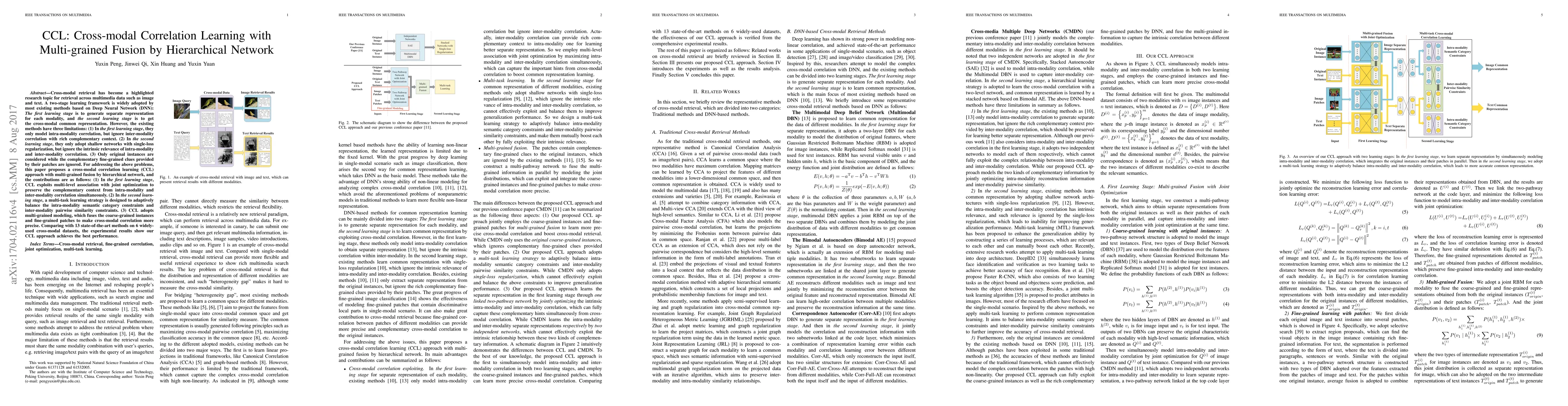 This paper proposes a cross-modal correlation learning (CCL) approach that utilizes a hierarchical network for multi-grained fusion, addressing limitations in existing methods by modeling both intra-modality and inter-modality correlations and incorporating fine-grained patch information. Experimental results show superior performance compared to 13 state-of-the-art methods across 6 datasets.