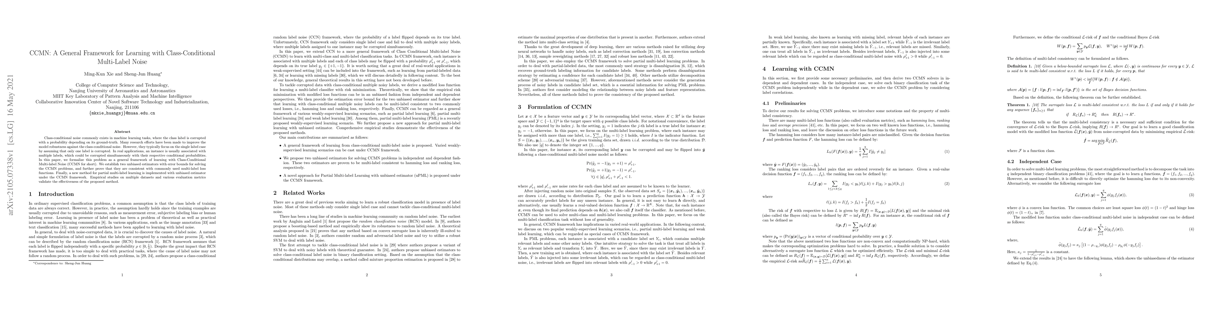 This paper introduces a framework for learning with Class-Conditional Multi-label Noise (CCMN), addressing the issue of multi-label instances where multiple labels can be corrupted simultaneously. It proposes two unbiased estimators and proves their consistency, implementing a new method for partial multi-label learning validated through empirical studies.