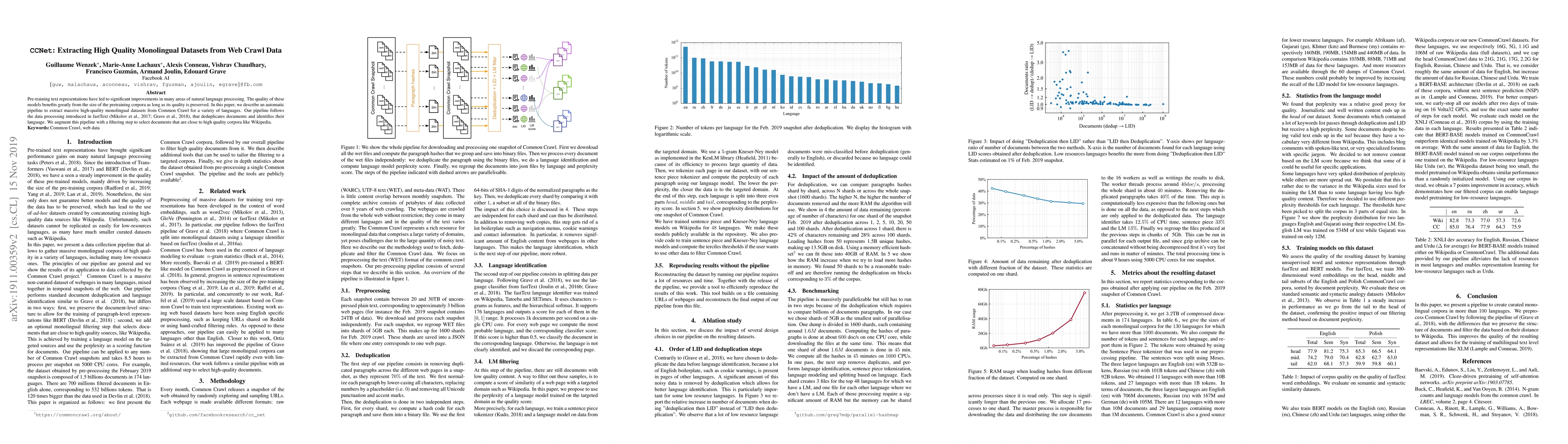 This paper presents an automated pipeline to extract large, high-quality monolingual datasets from Common Crawl data, following fastText's data processing methods, and adding a filtering step to enhance document quality akin to Wikipedia. The aim is to improve pre-training text representations for natural language processing.