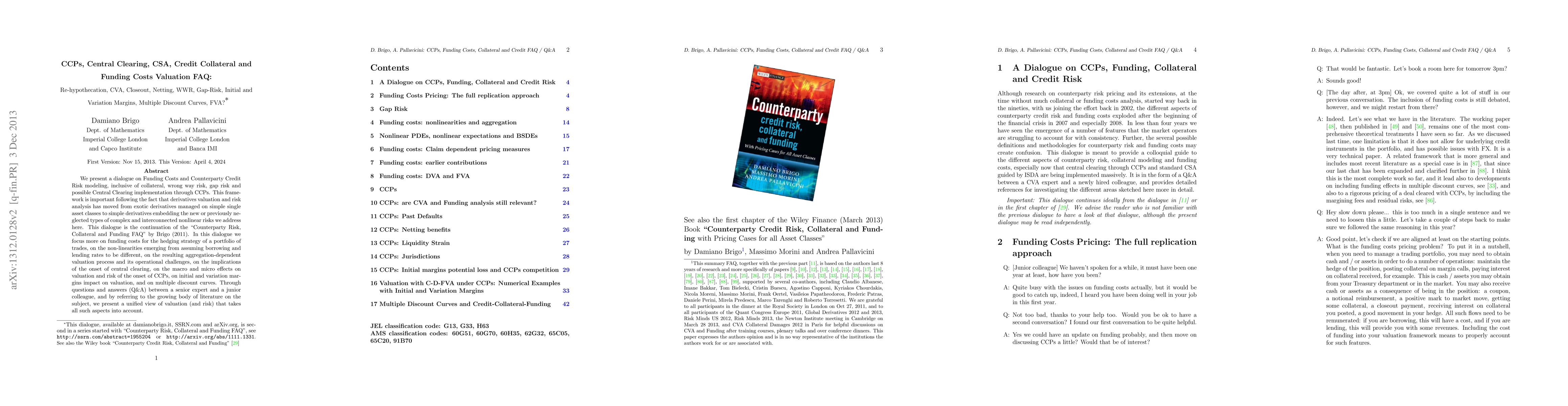 We present a dialogue on Funding Costs and Counterparty Credit Risk modeling, inclusive of collateral, wrong way risk, gap risk and possible Central Clearing implementation through CCPs. This framework is important following the fact that derivatives valuation and risk analysis has moved from exotic derivatives managed on simple single asset classes to simple derivatives embedding the new or previously neglected types of complex and interconnected nonlinear risks we address here. This dialogue is the continuation of the "Counterparty Risk, Collateral and Funding FAQ" by Brigo (2011). In this dialogue we focus more on funding costs for the hedging strategy of a portfolio of trades, on the non-linearities emerging from assuming borrowing and lending rates to be different, on the resulting aggregation-dependent valuation process and its operational challenges, on the implications of the onset of central clearing, on the macro and micro effects on valuation and risk of the onset of CCPs, on initial and variation margins impact on valuation, and on multiple discount curves. Through questions and answers (Q&A) between a senior expert and a junior colleague, and by referring to the growing body of literature on the subject, we present a unified view of valuation (and risk) that takes all such aspects into account.