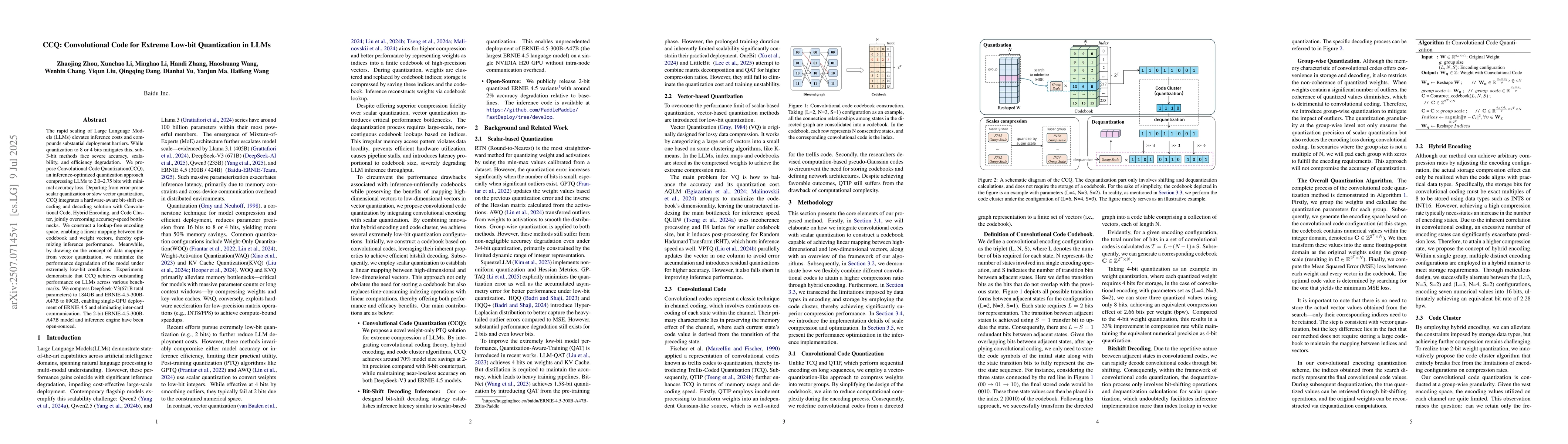 The research introduces Convolutional Code Quantization (CCQ), a method to compress Large Language Models (LLMs) to 2.0-2.75 bits with minimal accuracy loss, overcoming challenges in sub-3-bit quantization. CCQ combines hardware-aware bit-shift encoding, Convolutional Code, Hybrid Encoding, and Code Cluster, optimizing inference performance and minimizing degradation under low-bit conditions. It successfully compresses DeepSeek-V3 and ERNIE-4.5-300B-A47B models, enabling single-GPU deployment and open-sourcing the 2-bit ERNIE-4.5-300B-A47B model and inference engine.