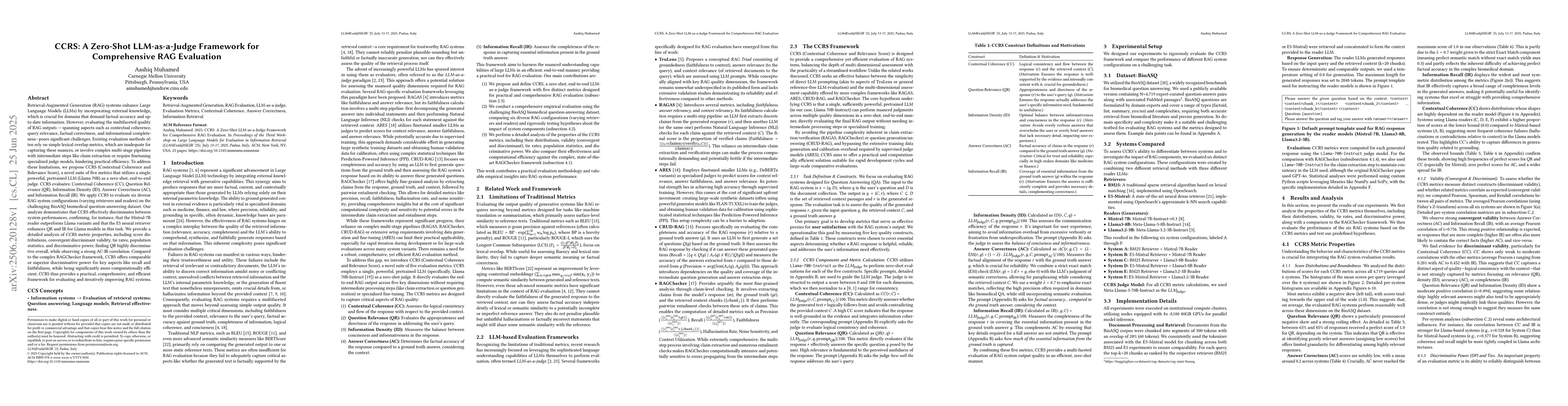 RAG systems enhance LLMs by incorporating external knowledge, which is crucial for domains that demand factual accuracy and up-to-date information. However, evaluating the multifaceted quality of RAG outputs, spanning aspects such as contextual coherence, query relevance, factual correctness, and informational completeness, poses significant challenges. Existing evaluation methods often rely on simple lexical overlap metrics, which are inadequate for capturing these nuances, or involve complex multi-stage pipelines with intermediate steps like claim extraction or require finetuning specialized judge models, hindering practical efficiency. To address these limitations, we propose CCRS (Contextual Coherence and Relevance Score), a novel suite of five metrics that utilizes a single, powerful, pretrained LLM as a zero-shot, end-to-end judge. CCRS evaluates: Contextual Coherence (CC), Question Relevance (QR), Information Density (ID), Answer Correctness (AC), and Information Recall (IR). We apply CCRS to evaluate six diverse RAG system configurations on the challenging BioASQ dataset. Our analysis demonstrates that CCRS effectively discriminates between system performances, confirming, for instance, that the Mistral-7B reader outperforms Llama variants. We provide a detailed analysis of CCRS metric properties, including score distributions, convergent/discriminant validity, tie rates, population statistics, and discriminative power. Compared to the complex RAGChecker framework, CCRS offers comparable or superior discriminative power for key aspects like recall and faithfulness, while being significantly more computationally efficient. CCRS thus provides a practical, comprehensive, and efficient framework for evaluating and iteratively improving RAG systems.