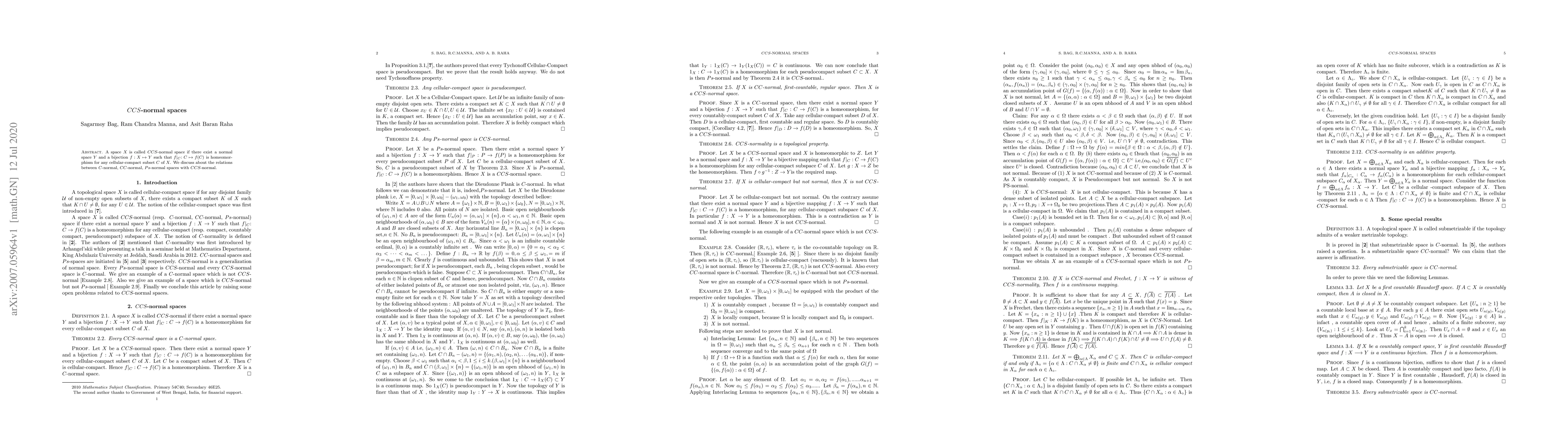 A space $X$ is called $CCS$-normal space if there exist a normal space $Y$ and a bijection $f: X\mapsto Y$ such that $f\lvert_C:C\mapsto f(C)$ is homeomorphism for any cellular-compact subset $C$ of $X$. We discuss about the relations between $C$-normal, $CC$-normal, $Ps$-normal spaces with $CCS$-normal.