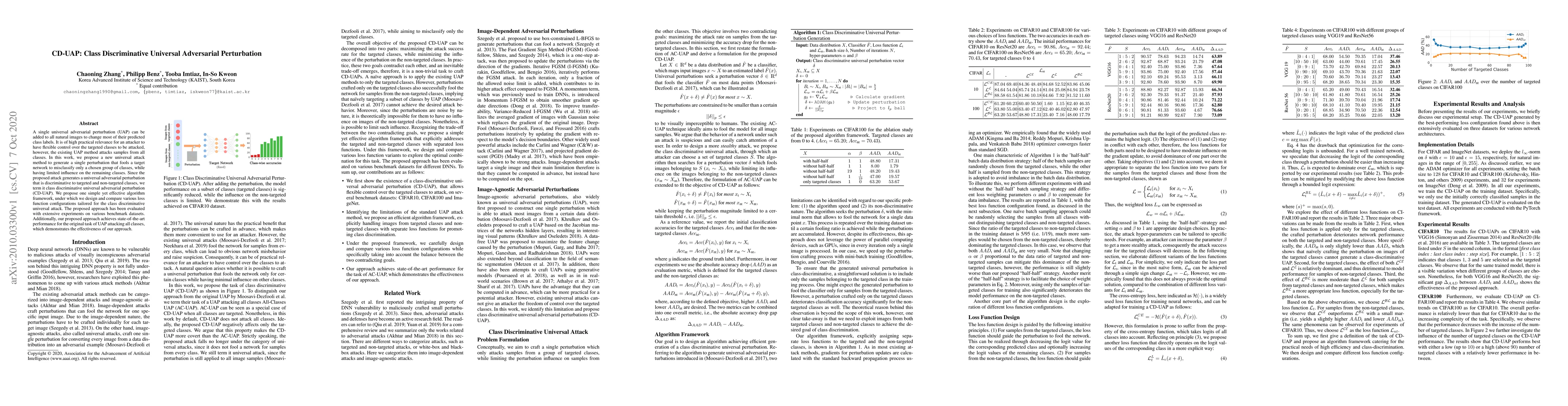 This paper introduces CD-UAP, a novel universal adversarial perturbation method that generates a single perturbation to misclassify only a chosen group of classes while minimally affecting others. The proposed approach achieves state-of-the-art performance in both targeted class discrimination and overall universal attack effectiveness.
