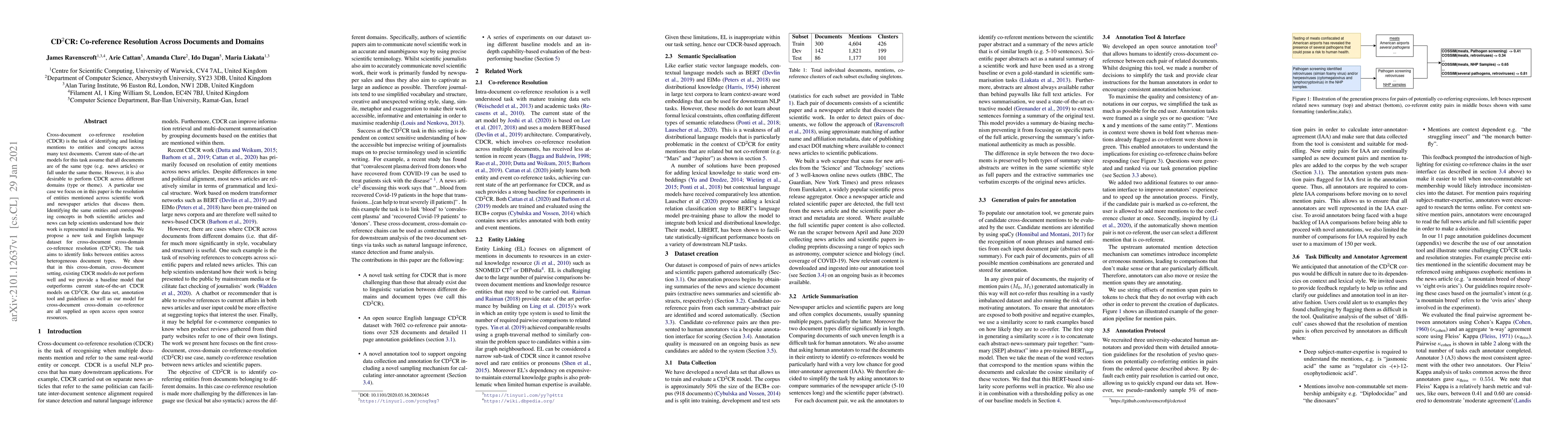This paper introduces a new task and dataset for cross-document co-reference resolution across different domains, focusing on linking entities between scientific articles and news reports. The proposed baseline model outperforms existing models in this cross-domain setting, and all resources are made available as open-source.