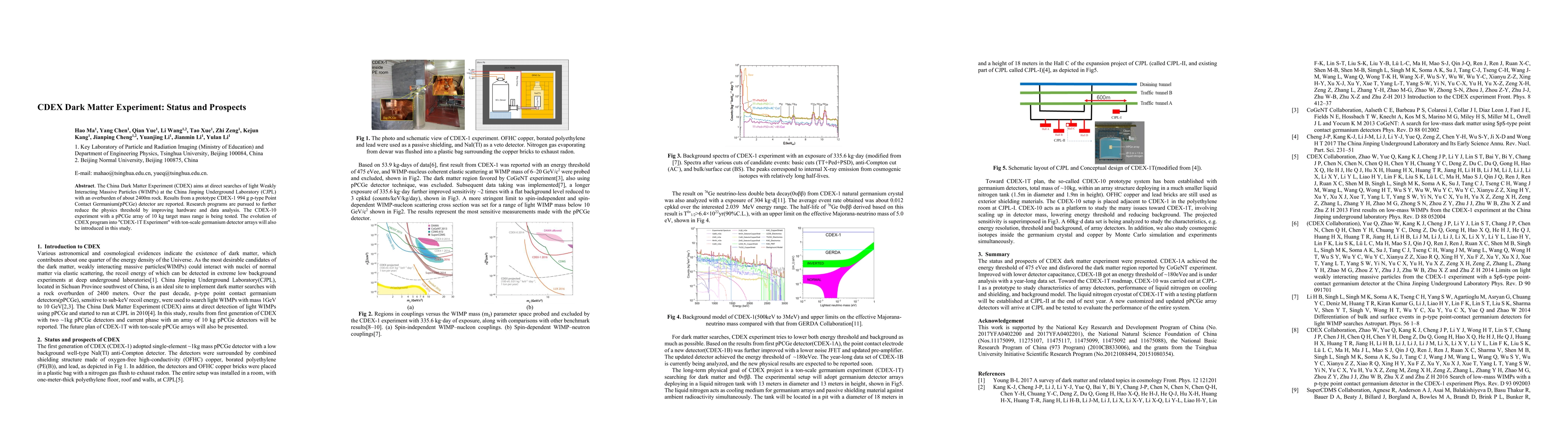 The China Dark Matter Experiment (CDEX) reports results from its prototype CDEX-1 detector and outlines plans for future experiments, including the CDEX-10 and the upcoming ton-scale CDEX-1T, aiming to enhance sensitivity in direct WIMP searches at the CJPL. Efforts focus on improving hardware and data analysis to reduce the physics threshold.