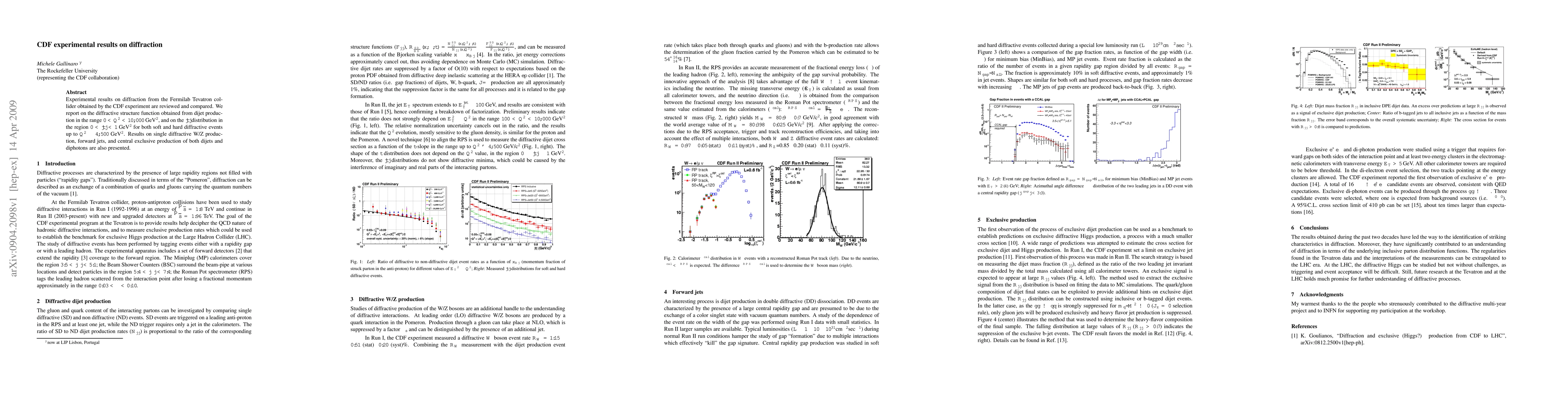 The CDF experimental results from the Fermilab Tevatron collider detail diffraction studies, including diffractive structure functions from dijet production and $|t|$ distributions for soft and hard diffractive events. Findings on single diffractive W/Z production, forward jets, and central exclusive production of dijets and diphotons are also reported.