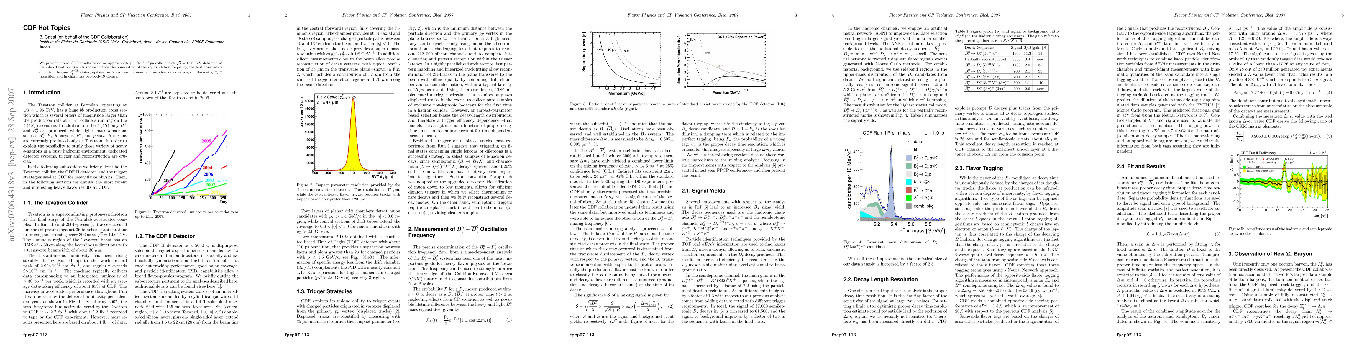 We present recent CDF results based on approximately 1 fb$^{-1}$ of $p\bar p$ collisions at $\sqrt s = 1.96$ TeV delivered at Fermilab Tevatron. Results shown include the observation of the $B_s$ oscillation frequency, the first observation of bottom baryon $\Sigma_b^{(*)\pm}$ states, updates on $B$ hadrons lifetimes, and searches for rare decays in the $b\to s\mu^+\mu^-$ transition and in charmless two-body B decays.