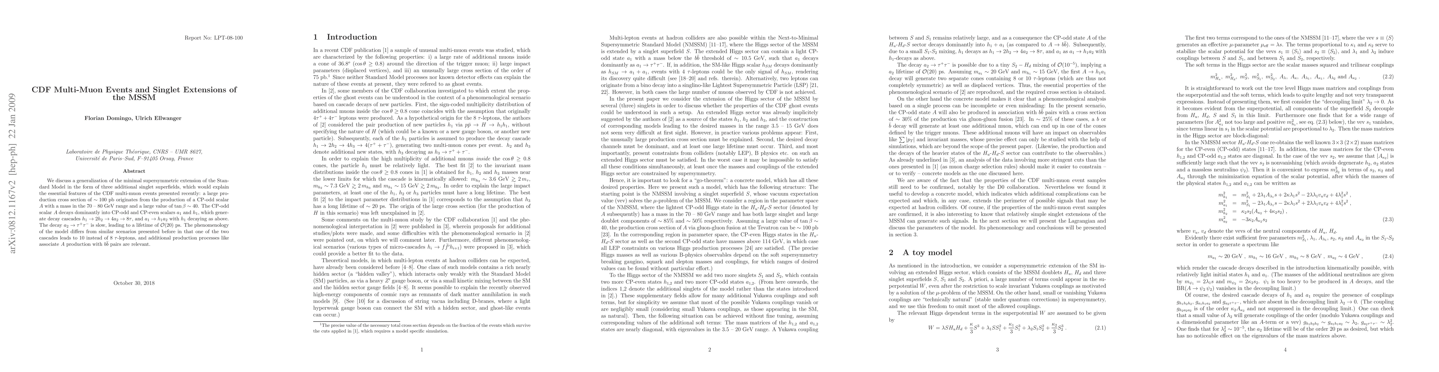 We discuss a generalization of the minimal supersymmetric extension of the Standard Model in the form of three additional singlet superfields, which would explain the essential features of the CDF multi-muon events presented recently: a large production cross section of ~ 100 pb originates from the production of a CP-odd scalar A with a mass in the 70 - 80 GeV range and a large value of tan(beta) ~ 40. The CP-odd scalar A decays dominantly into CP-odd and CP-even scalars a_1 and h_1, which generate decay cascades h_1 -> 2 h_2 -> 4 a_2 -> 8 tau-leptons, and a_1 -> h_1 a_2 with h_1 decaying as above. The decay a_2 -> tau+ tau- is slow, leading to a lifetime of O(20) ps. The phenomenology of the model differs from similar scenarios presented before in that one of the two cascades leads to 10 instead of 8 tau-leptons, and additional production processes like associate A production with b b-bar pairs are relevant.