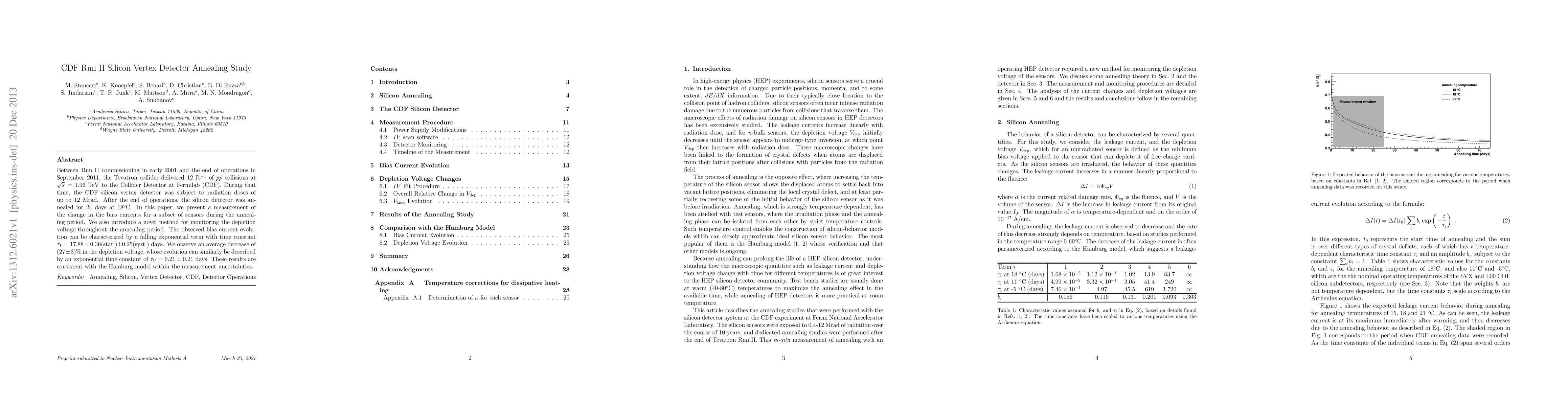 Between Run II commissioning in early 2001 and the end of operations in September 2011, the Tevatron collider delivered 12~fb$^{-1}$ of $p\bar{p}$ collisions at $\sqrt{s}=1.96$ TeV to the Collider Detector at Fermilab (CDF). During that time, the CDF silicon vertex detector was subject to radiation doses of up to 12 Mrad. After the end of operations, the silicon detector was annealed for 24 days at $18^{\circ}$C. In this paper, we present a measurement of the change in the bias currents for a subset of sensors during the annealing period. We also introduce a novel method for monitoring the depletion voltage throughout the annealing period. The observed bias current evolution can be characterized by a falling exponential term with time constant $\tau_I=17.88\pm0.36$(stat.)$\pm0.25$(syst.) days. We observe an average decrease of $(27\pm3)\%$ in the depletion voltage, whose evolution can similarly be described by an exponential time constant of $\tau_V=6.21\pm0.21$ days. These results are consistent with the Hamburg model within the measurement uncertainties.