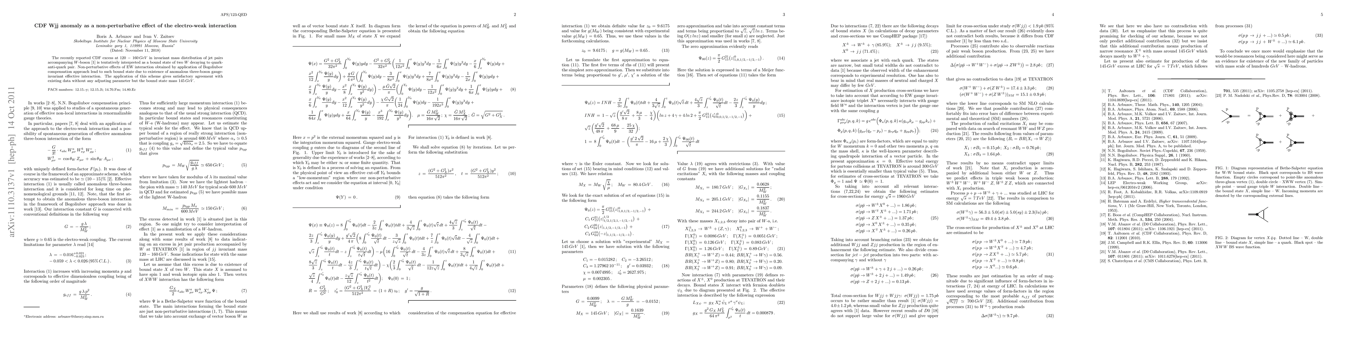 The recently reported CDF excess at $120\,-\, 160\,GeV$ in invariant mass distribution of jet pairs accompanying $W$-boson is tentatively interpreted as a bound state of two $W$ decaying to quark-anti-quark pair. Non-perturbative effects of EW interaction obtained by application of Bogoliubov compensation approach lead to such bound state due to existence of anomalous three-boson gauge-invariant effective interaction. The application of this scheme gives satisfactory agreement with existing data without any adjusting parameter but the bound state mass $145\,GeV$.